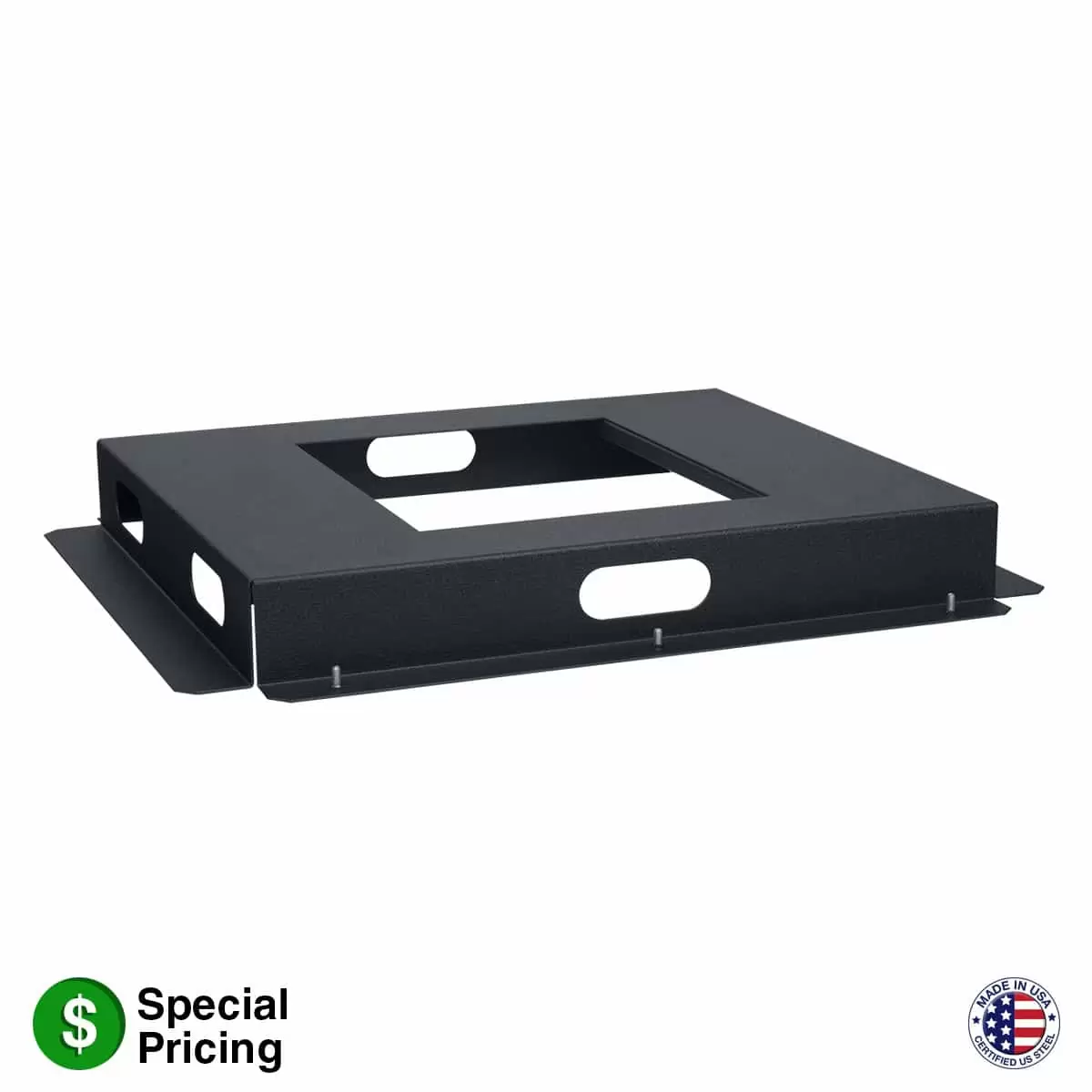Stationary base mounts inside the frame of a compatible 19-inch stand-alone rack, creating a floor positioned flush to bottom rack space. The LSB Series is often specified to provide extra support for heavy equipment to be mounted in the lowest rack position. This rack base does not increase overall rack height.