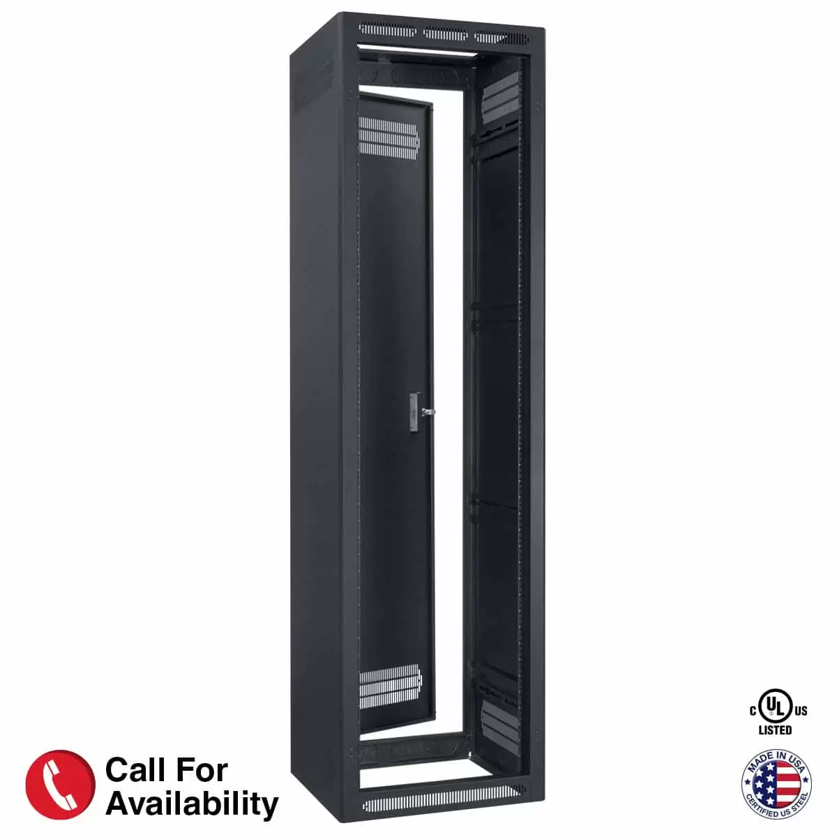 The EIA/TIA-compliant floor rack shall be Lowell Model LSER-4427. Overall measurements shall be 83.125″H x 27″D x 23.06″W with panel space of 44 rack units. UL-Listed load capacity shall be 3150 lbs. The rack shall include a recessed rear door with vents and key lock, welded side panels with vents, top with 12U opening, open base with grounding stud and corner weldments, one-pair adjustable front mounting rails with printed RU increments, combination knockout panels above and below rear door, and provisions to mount an optional surface-mount front door or rear rails (ordered separately). The rack shall be manufactured in the USA using USA-certified steel and have a black-textured powder-coat finish. It shall be UL2416 Listed, Trade Agreement Act (TAA) compliant, and Buy American Act (BAA) compliant.