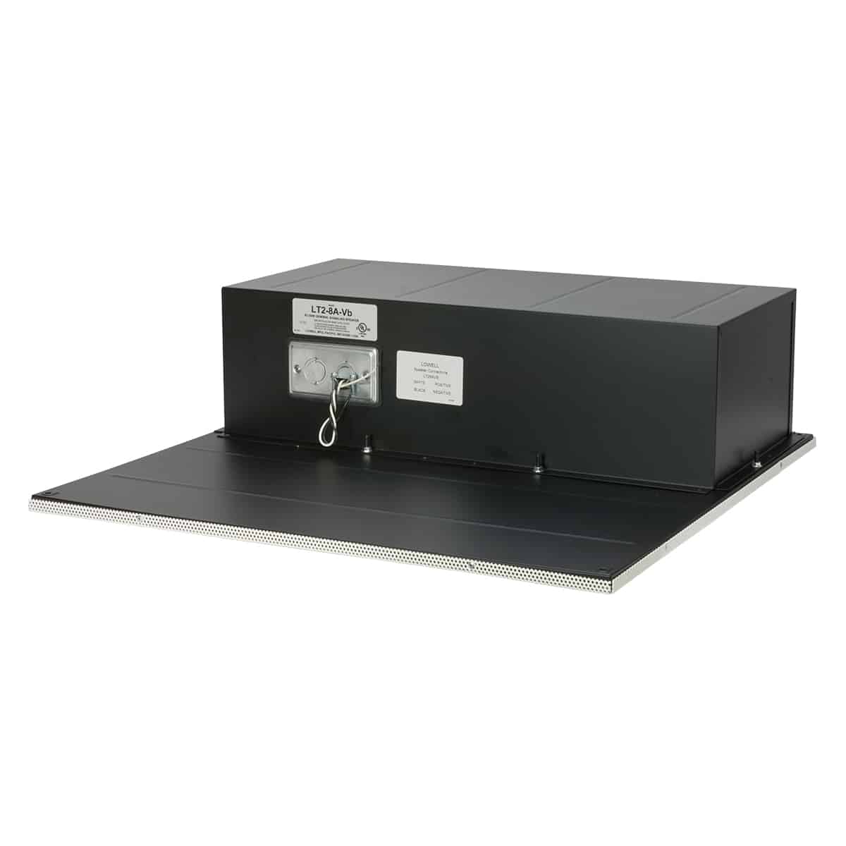 The pro speaker for tile ceiling shall be Lowell Model LT2-8A-Vb. The 2’x2′ system shall directly replace a 2’x2′ ceiling tile. Each speaker system shall include a factory-mounted driver mounted to a sub-plate with a fine perforation steel grille finished in white powder epoxy. The driver shall be 8 in. coaxial with a power rating of 50W. It shall have ceramic magnet weight of 20 ozs. (LF) and 2 ozs. (HF), frequency response of 40Hz–19.4kHz (±6dB) and 40Hz–20kHz (±7.3dB) and sensitivity of 90.6dB avg. measured 1W/1M. The system shall include a steel backbox (.8 cu.ft.) with acoustic lining, removable dual knockout wiring compartment cover plate with 1/2 in.—3/4 in. combination knockouts, and leads exiting through a metal clamp.
