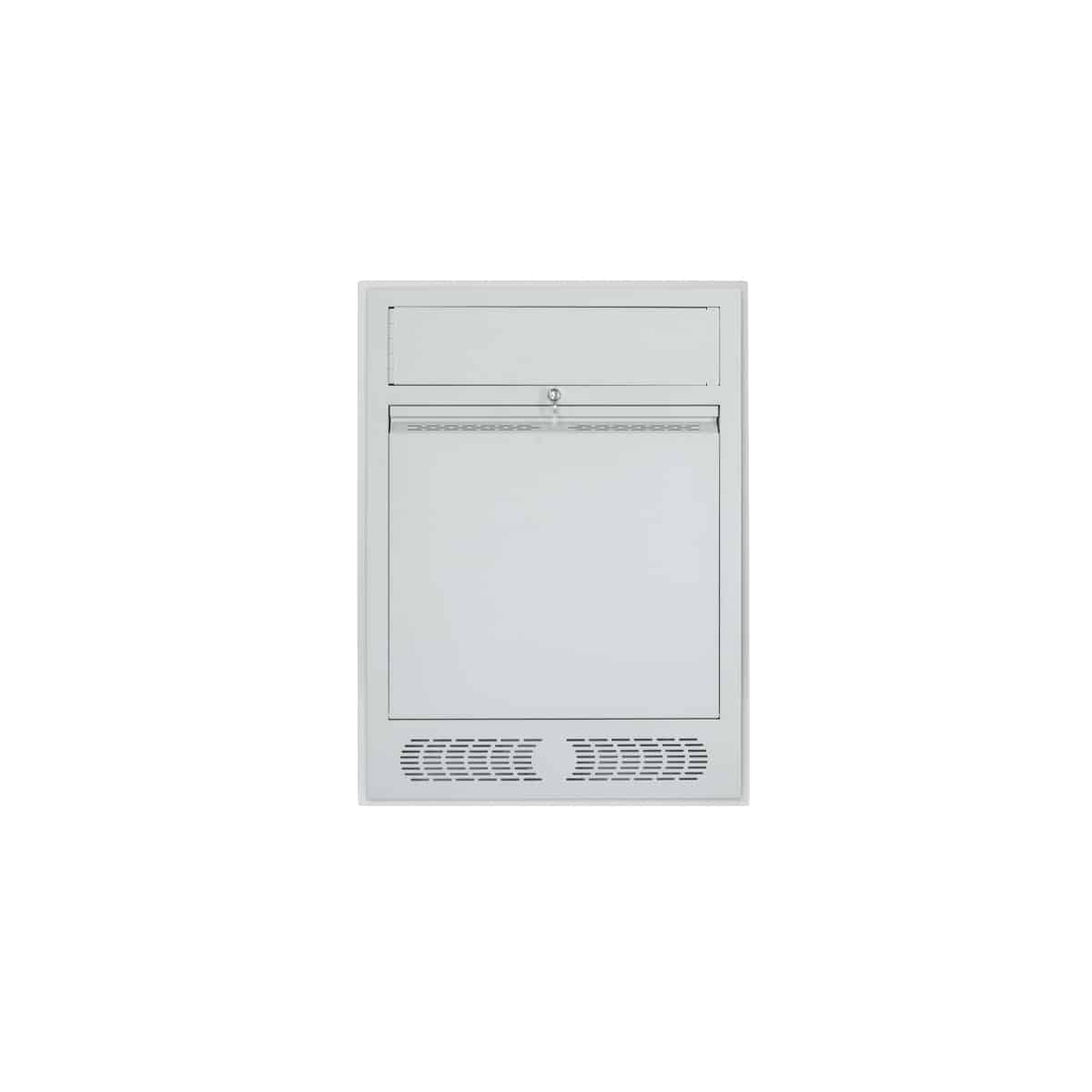 The LTCR wall rack features dampers that control the opening of the main compartment, ensuring a slow lowering of the vertically-mounted equipment. The top compartment (upper bay) is designed to mount a horizontal control panel and is hinged for swing-out access. This model is for recessed installation and includes a trim plate. Network-Grey powder-coat finish. Includes electrical box in the base.