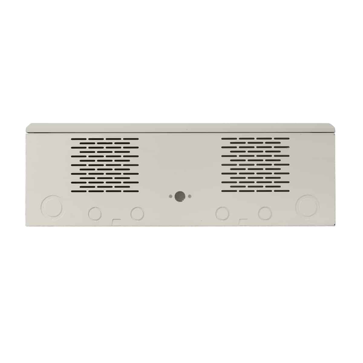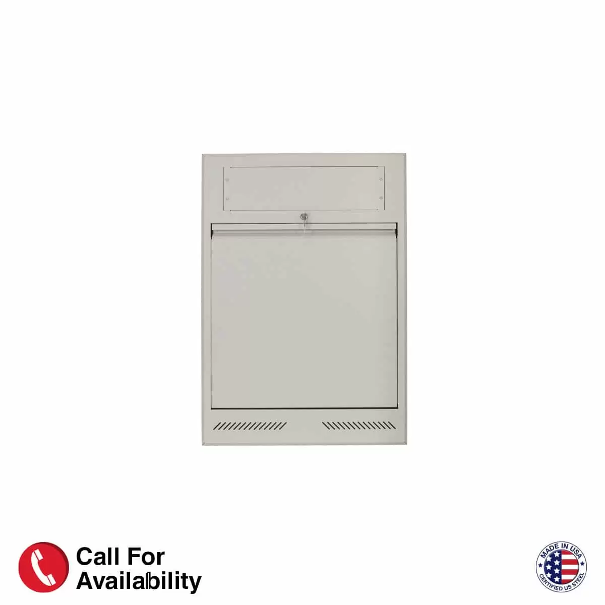The surface-mount wall rack with tilt-open operation shall be Lowell Model LTR-420S, which shall provide four rack units for vertical mounting of 19 inch wide equipment (useable depth —first panel space max. 18 in., 2-4 panel spaces max. 20 in.). Overall rack measurements shall be 35.00″H x 24.50″W x 8.07″D. The rack shall feature vents in front and base, compound knockouts in top and base, center key lock and integral handle for main compartment, removable 3U top panel, center cutout in back, clamping bracket to secure equipment, DIN rail and EO box in base, and one-pair of adjustable mounting rails tapped 10-32. The assembly shall have a load capacity of 100 lbs. The rack shall be manufactured in the USA using USA-certified steel and have a Network-Grey powder-coat finish. It shall be Trade Agreement Act (TAA) compliant and Buy American Act (BAA) compliant.