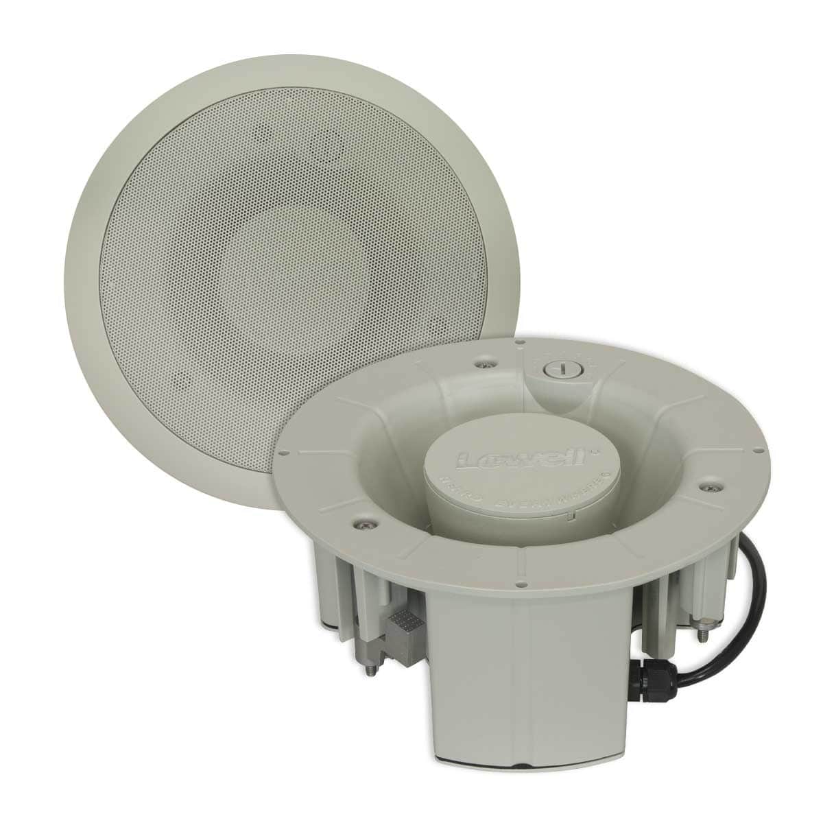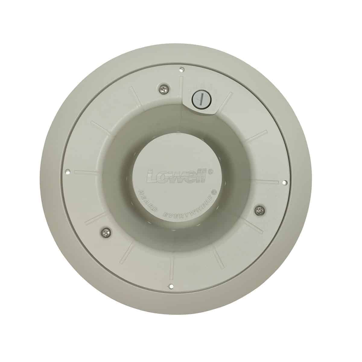 The paging re-entrant horn shall be Lowell Model LUH-15TA, which shall include a self-contained compression driver in aluminum weather-resistant housing that can be installed in 4 inch deep spaces. Power rating shall be 15 watts continuous. Frequency response shall be 740Hz–7.4kHz ±6dB). Sound pressure level shall be 105dB (1W1M) average, 116.8dB SPL (max) 15W/1M calculation based on power rating and measured sensitivity. Dispersion shall be 80 degrees conical @2000Hz (-6dB). Unit shall include a 100/70/25V transformer with taps selectable on front and rear of horn, and includes an 8ohm transformer bypass input. The horn will ship ready for standard two-wire connection with cable exiting through a rear waterproof gland-type connector. Housing shall be 7.1 in. diameter at its widest measure with an 8 in. diameter flat face. The assembly shall include an aluminum trim ring/grille (9.6 in. diameter) and have no visible hardware and neutral grey finish. The assembly shall mount using three screwdriver-activated clamps that are adjustable for depths of 0 to 1.5 in. (factory setting) or 1 to 2.125 in. (when dog ear clamps are reversed), or it can be mounted using screws (not included).