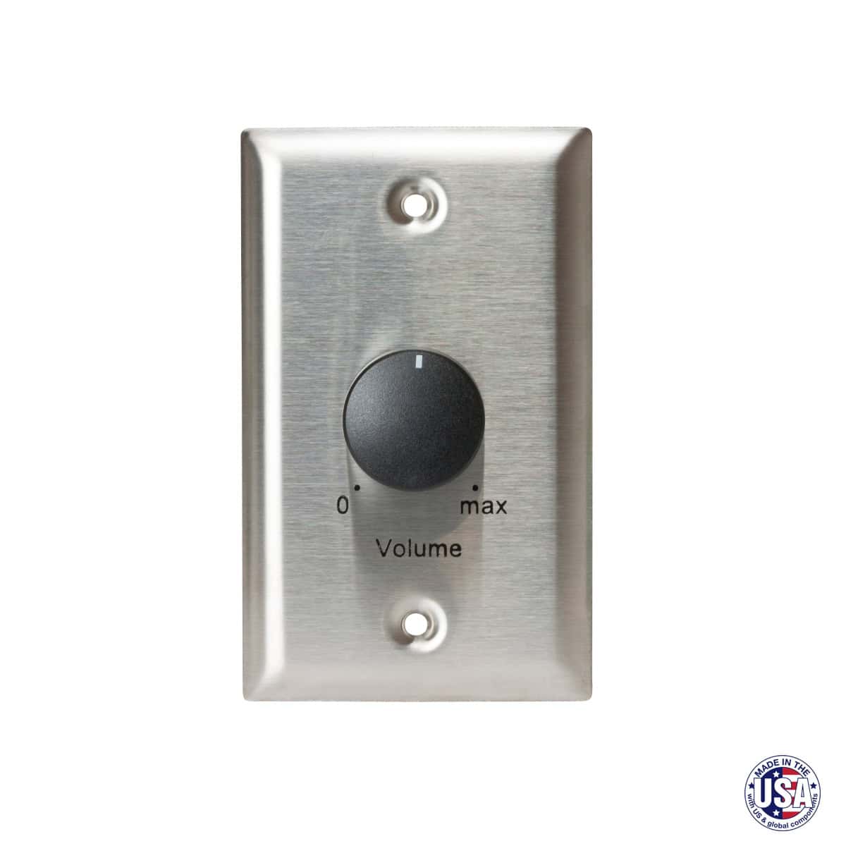 The potentiometer control with 5000 ohm impedance shall be Lowell Model LV-5K. It shall include a one-gang stainless steel wall plate with dial scale (0-10), fluted knob, and mounting screws. It shall feature continuous attenuation (no stops). The potentiometer shall be Made in the USA with US and global components, and shall be Trade Agreements Act (TAA) compliant.