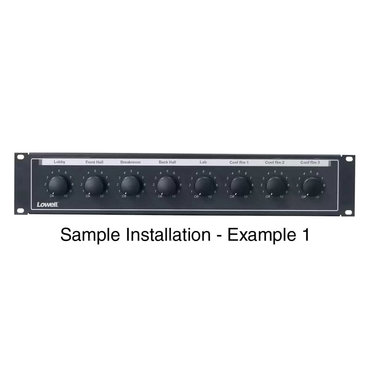 The rackmount panel for volume controls shall be Lowell Model LVC8P-ID-2. It shall be formed steel construction with a smooth black epoxy finish and 8 punched holes. Overall measurements shall be 19″W x 2U. The panel shall include hardware and a clear plastic overlay for labels.