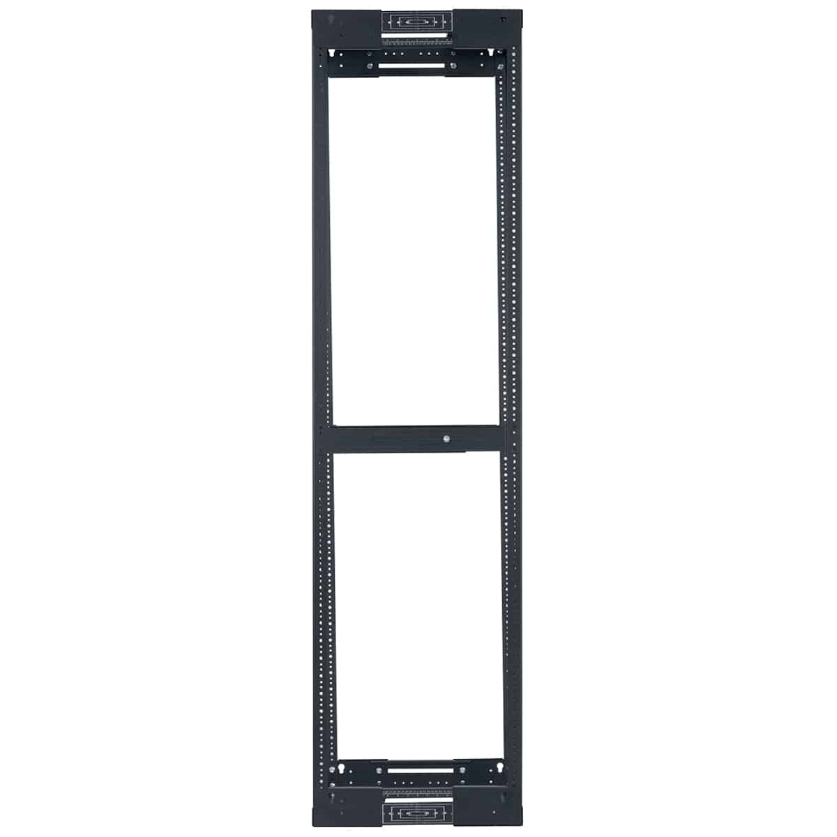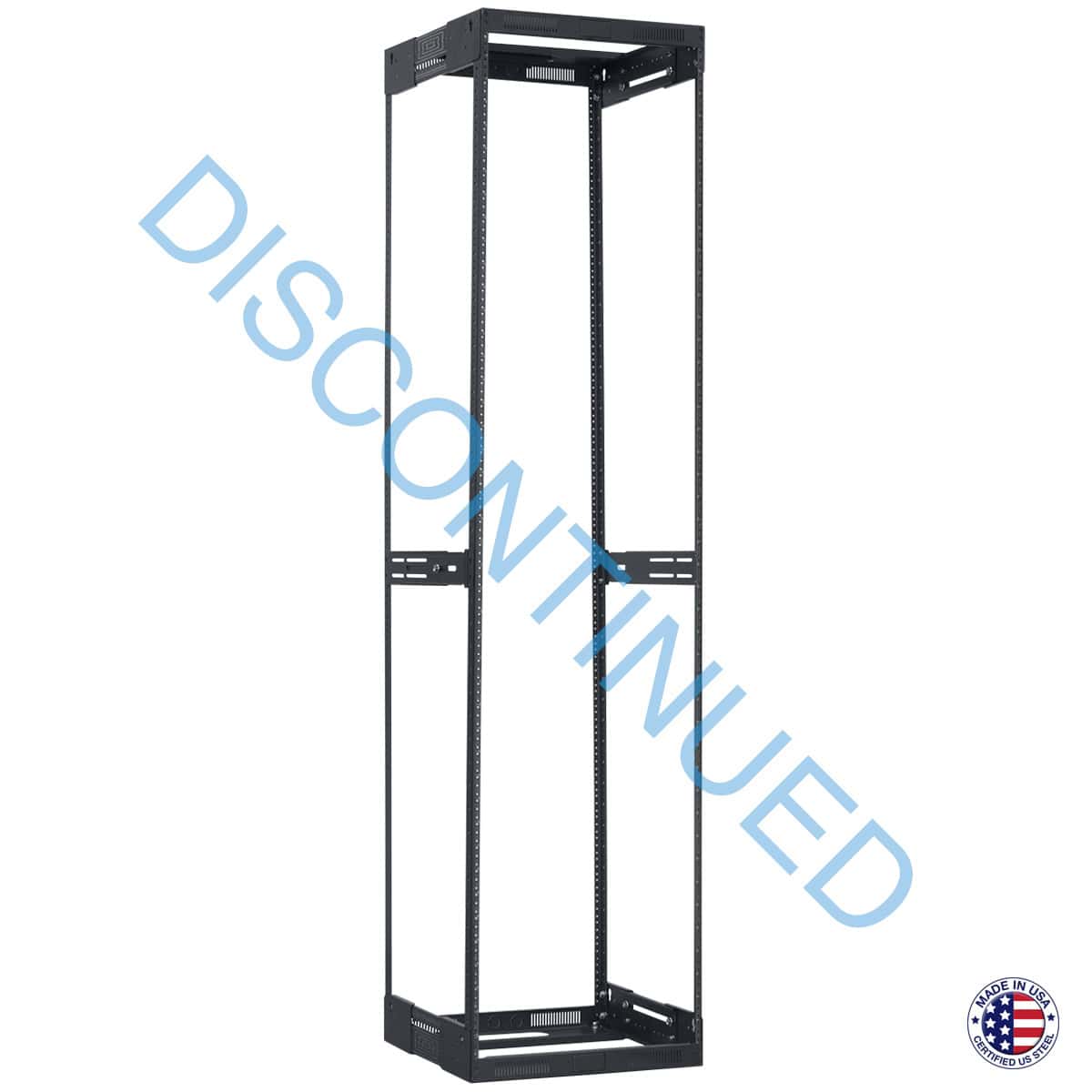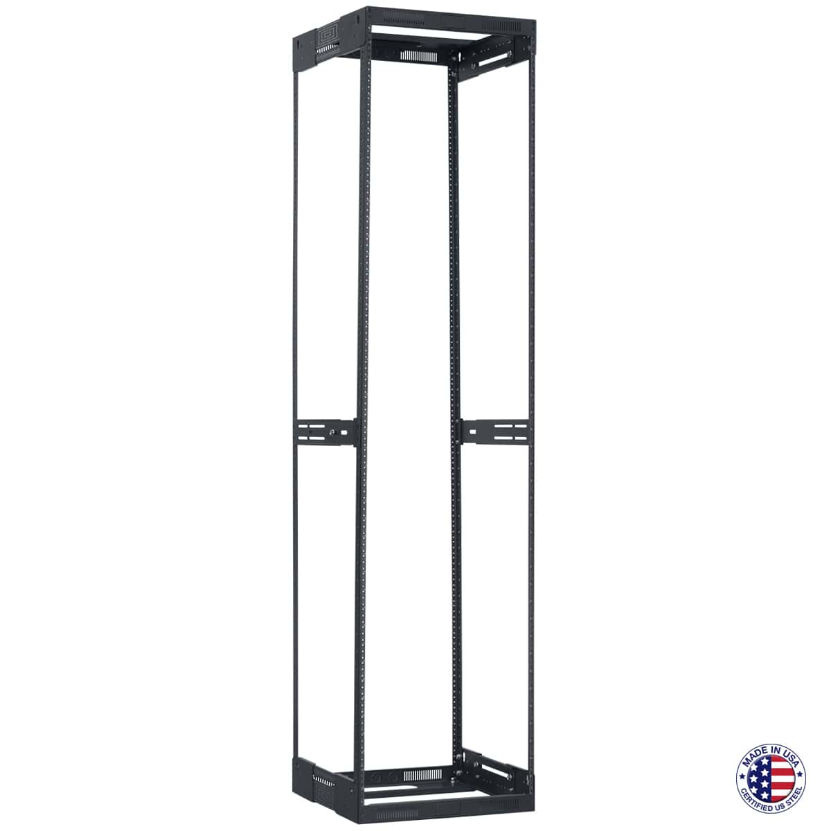 The rack shall be Lowell Model LVR44-1421, which shall provide 30 rack units of panel space and measure 19.21″W by 80.84″H and have a depth that can be set anywhere between 14″ to 21″ during assembly (17.5″ to 21″ with side support brackets). Base and top components shall ship pre-assembled except for the depth selection. Corner post mounting rails shall be 11-gauge steel tapped 10-32 with a printed rack unit scale. The rack shall have a smooth black powder epoxy finish.