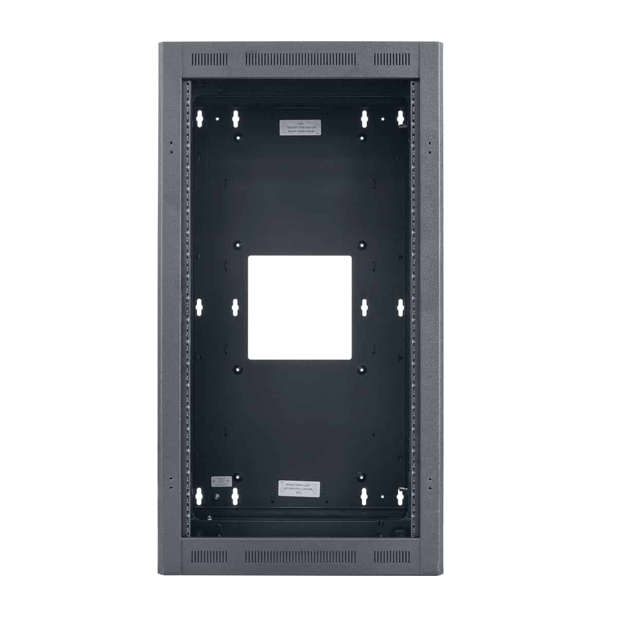 The EIA-compliant welded sectional wall rack shall be Lowell Model LWR-2123, which shall consist of a backbox and mounting section made from 16-gauge steel. Overall measurements shall be 42.875″H x 23.05″D x 23.06″W (21U racking space). The mounting section shall be 17.06″D with triple-formed side-to-bottom, side-to-top wrapped construction to achieve strength equivalent to 3/16″ thick steel. It shall include side vents, one-pair adjustable mounting rails tapped 10-32 (with mounting hardware), four knockouts for antennas (top and bottom), and integral rails on EIA spacing (top and bottom). The mounting section shall attach to the backbox on the inside with two heavy-duty, spring-loaded L-pins (self-seating, positive-locking), which can be attached on either side to alter swing orientation. The backbox shall be 5.80″D with keyhole mounting slots on 16″ centers, 10″ x 10″ rear opening, embossed dimples and lacing points on the back plane, knockout panels with combination knockouts on top and bottom, and two keyed side locks. The rack shall be manufactured in the USA using USA-certified steel and have a black-textured powder-coat finish. It shall be UL 2416 Listed, Trade Agreement Act (TAA) compliant, and Buy American Act (BAA) compliant.