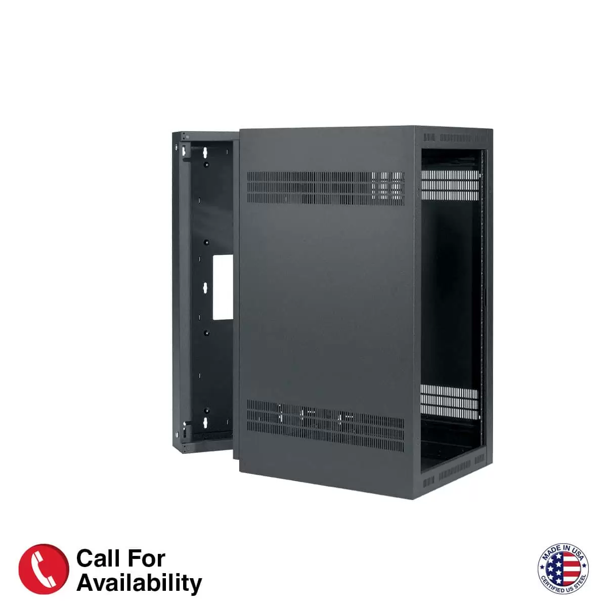 The EIA-compliant, welded sectional wall rack shall be Lowell Model LWR-2432, which shall consist of a backbox and mounting section made from 16-gauge steel. Overall measurements shall be 48.125″H x 32.057″D x 23.06″W (24U racking space). The mounting section shall be 26.06″D with triple-formed side-to-bottom, side-to-top wrapped construction to achieve strength equivalent to 3/16″ thick steel. It shall include side vents, one-pair adjustable mounting rails tapped 10-32 (with mounting hardware), four knockouts for antennas (top and bottom), and integral rails on EIA spacing (top and bottom). The mounting section shall attach to the backbox on the inside with two heavy-duty, spring-loaded L-pins (self-seating, positive-locking), which can be attached on either side to alter swing orientation. The backbox shall be 5.80″D with keyhole mounting slots on 16″ centers, 10″ x 10″ rear opening, embossed dimples and lacing points on the back plane, knockout panels with combination knockouts on top and bottom, and two keyed side locks. The rack shall be manufactured in the USA using USA-certified steel and have a black-textured powder-coat finish. It shall be Trade Agreement Act (TAA) compliant, and Buy American Act (BAA) compliant.