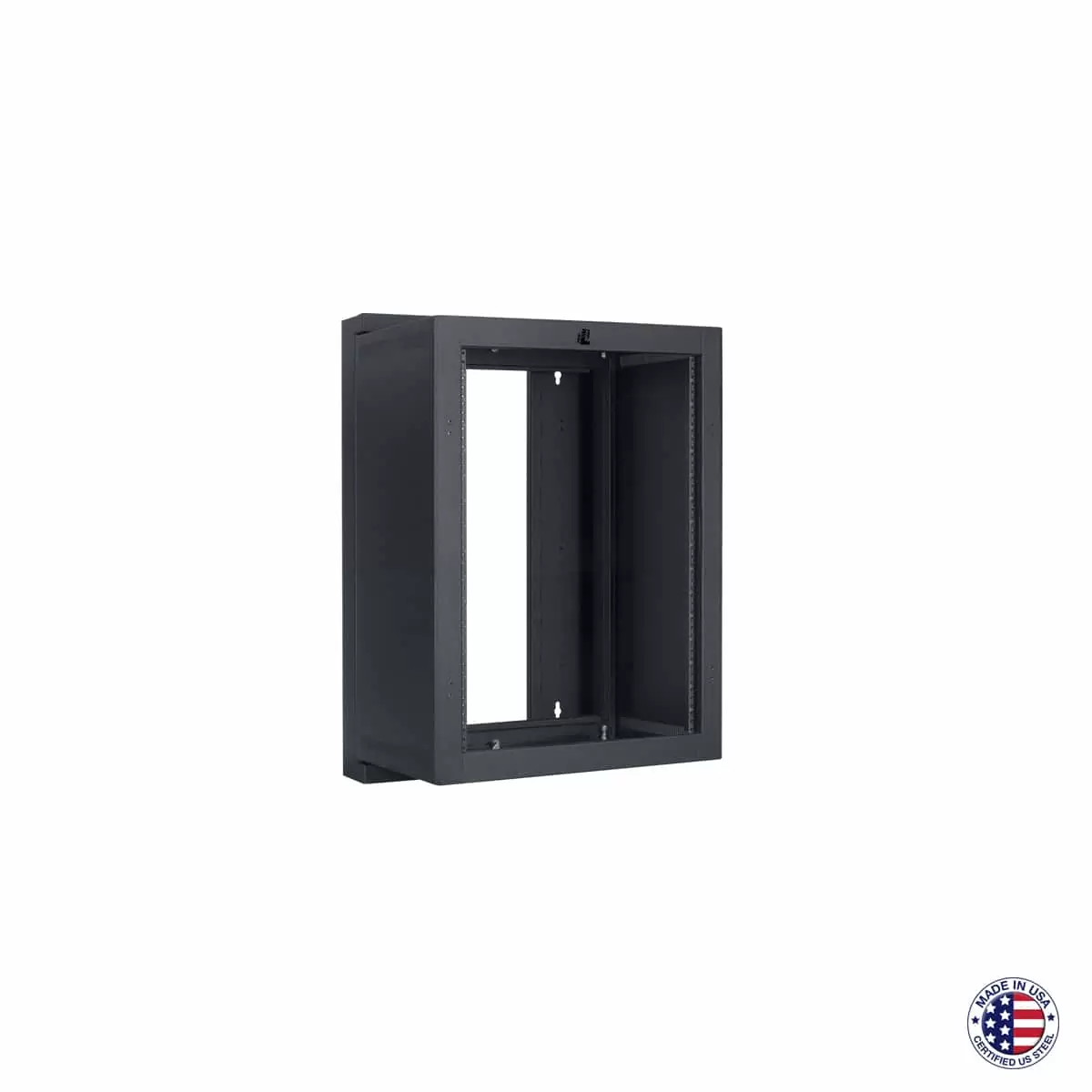 The wall-mount rack shall be Lowell Model LWSR-1622 which shall feature a backbox and mounting section. Overall measurements shall be 35.83″H x 21.92″D x 23.06″W with 16 rack units of panel space. The mounting section shall have top/bottom side vents and one pair of fixed-position front mounting rails tapped 10-32 and marked with rack unit increments. It shall attach to the backbox with heavy-duty bolts that can be moved to the opposite side to change swing orientation. The backbox shall measure 3.65″D and be formed from 16-gauge steel with keyhole mounting slots on 16″ centers. It shall feature a 10″W center wiring path, integral laser-cut sections with knockout panels on top/bottom, lacing points on back plane, and keyed locks at top and bottom. Knockout panels shall have 1/2″ knockouts for wireless antennas; 3/4-1/2″ and 1-1/2″-1″ compound knockouts for conduit. The rack shall be manufactured in the USA using USA-certified steel and have a black-textured powder-coat finish. It shall be Trade Agreement Act (TAA) compliant and Buy American Act (BAA) compliant.