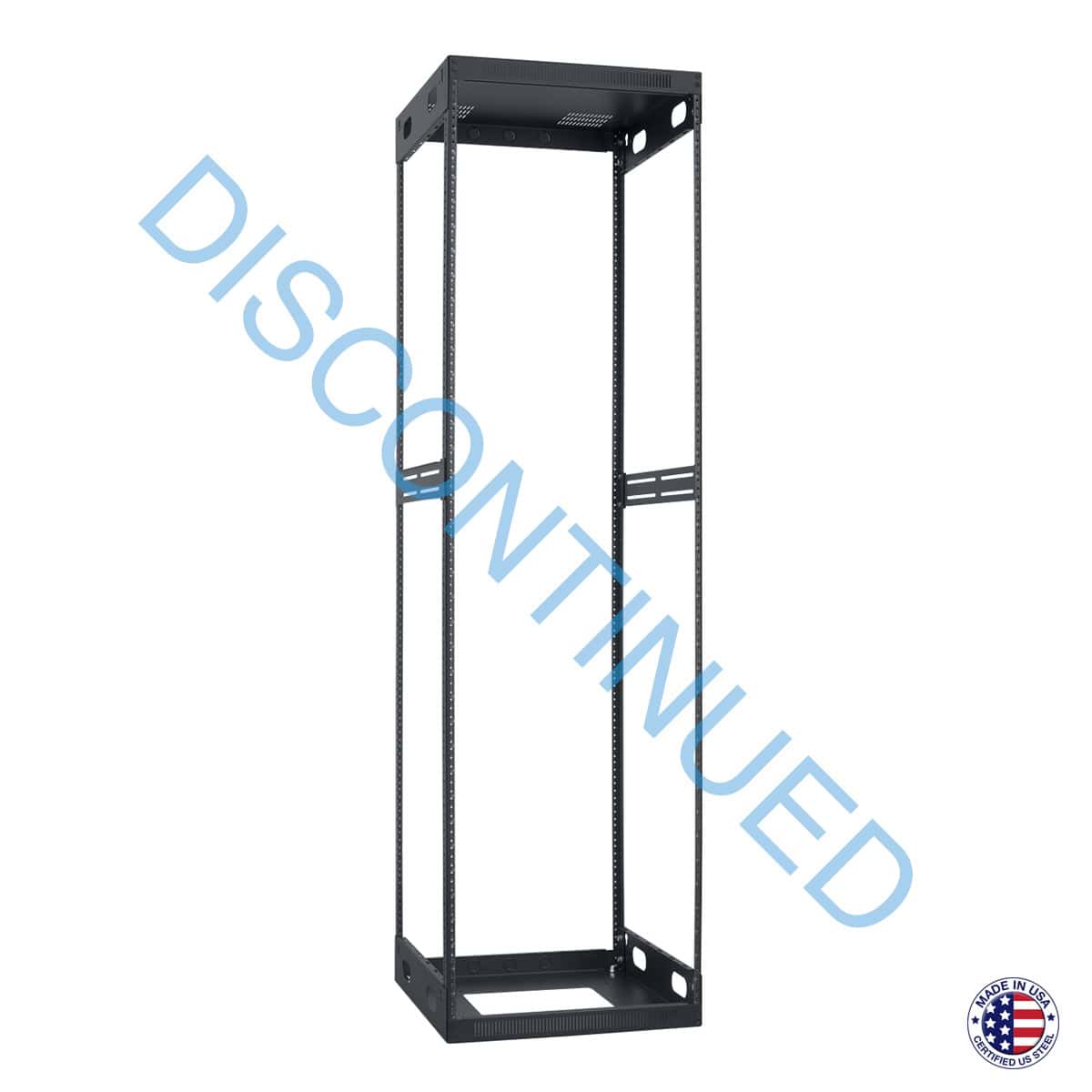 Slim open frame AV rack with 19-inch wide footprint is ideal for cabinets, closets or credenzas where space is at a premium but it can also serve as a stand-alone or gangable floor rack. The top has two vents, while the base features a large center opening. Steel with black powder epoxy finish. An assortment of optional accessories can be used to build a variety of profiles. Ships unassembled.