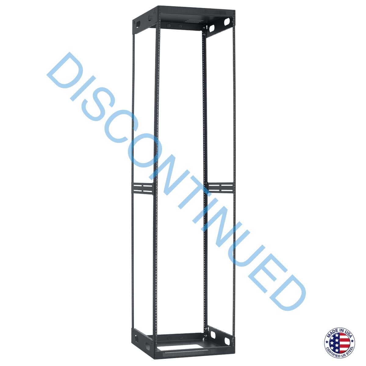Slim open frame AV rack with 19-inch wide footprint is ideal for cabinets, closets or credenzas where space is at a premium but it can also serve as a stand-alone or gangable floor rack. The top has two vents, while the base features a large center opening. Steel with black powder epoxy finish. An assortment of optional accessories can be used to build a variety of profiles. Ships unassembled.