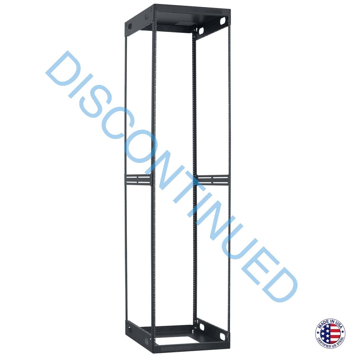 Slim open frame AV rack with 19-inch wide footprint is ideal for cabinets, closets or credenzas where space is at a premium but it can also serve as a stand-alone or gangable floor rack. The top has two vents, while the base features a large center opening. Steel with black powder epoxy finish. An assortment of optional accessories can be used to build a variety of profiles. Ships unassembled.