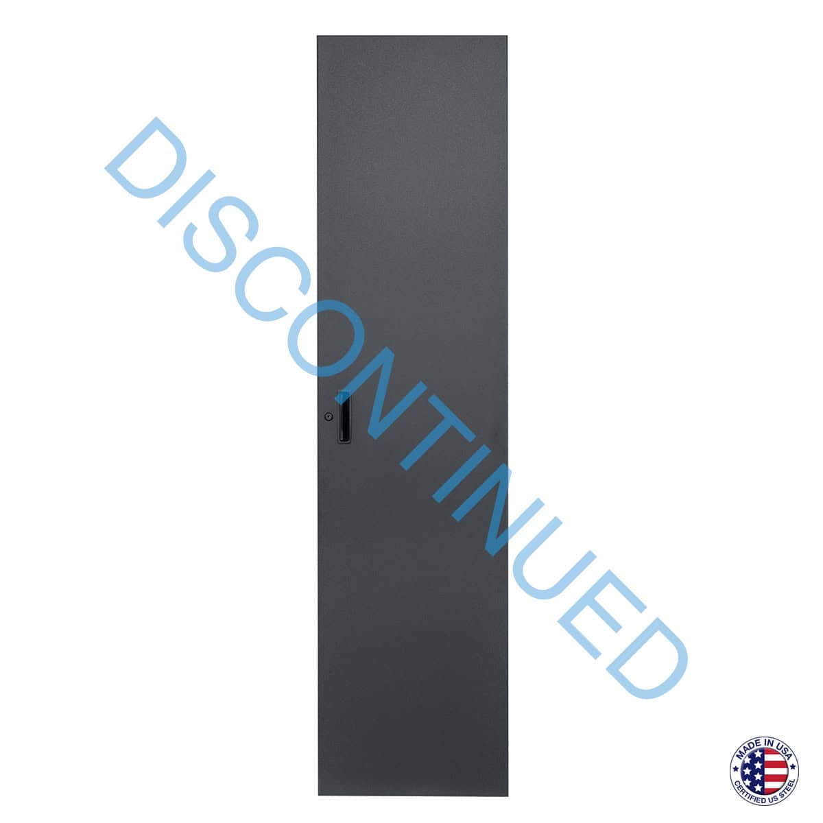 Surface-mount solid front door for slim frame rack (LXR, LVR Series) features recessed handle and key lock. The steel door with black wrinkle powder epoxy finish can be mounted with left or right-hand swing.