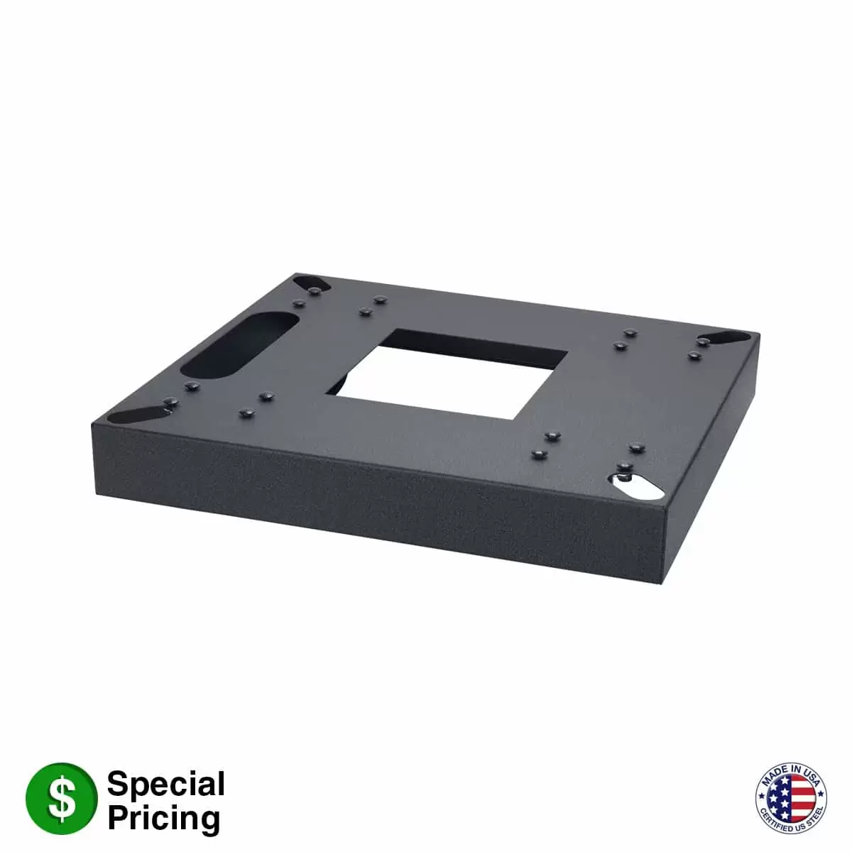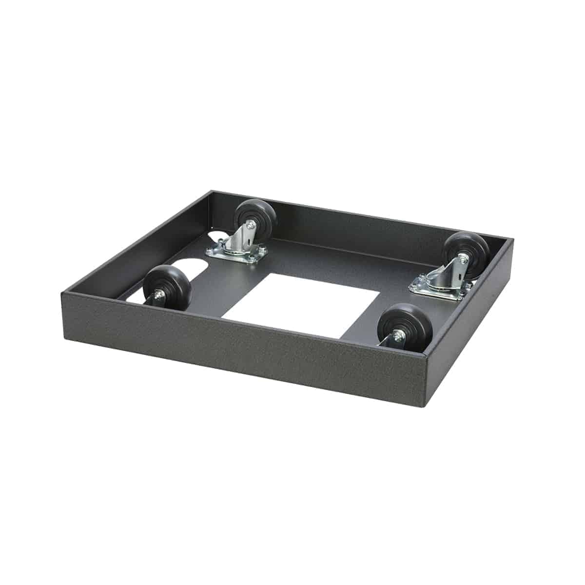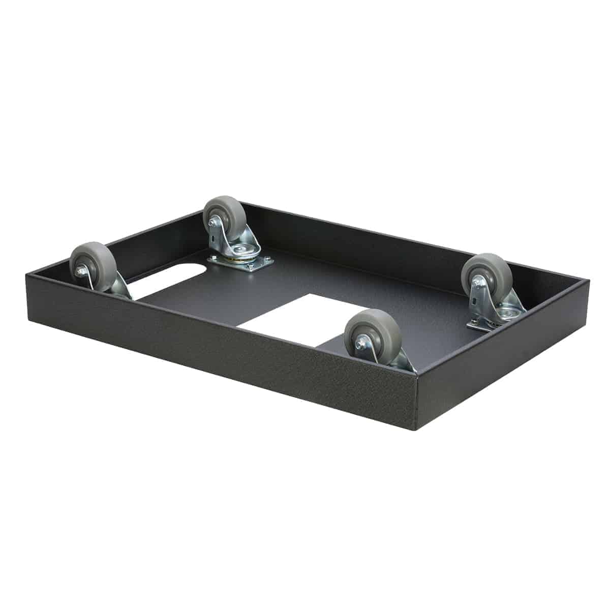 The mobile base for the rack shall be Lowell Model No. ____________, which shall mount under the rack frame. Construction shall be 16-gauge welded steel with bottom opening and black finish. Heavy-duty non-locking swivel casters shall be inside the platform increasing rack height. The casters shall be __________ (standard, fine-floor) with total load rating of ____ lbs. Mounting hardware shall be included.