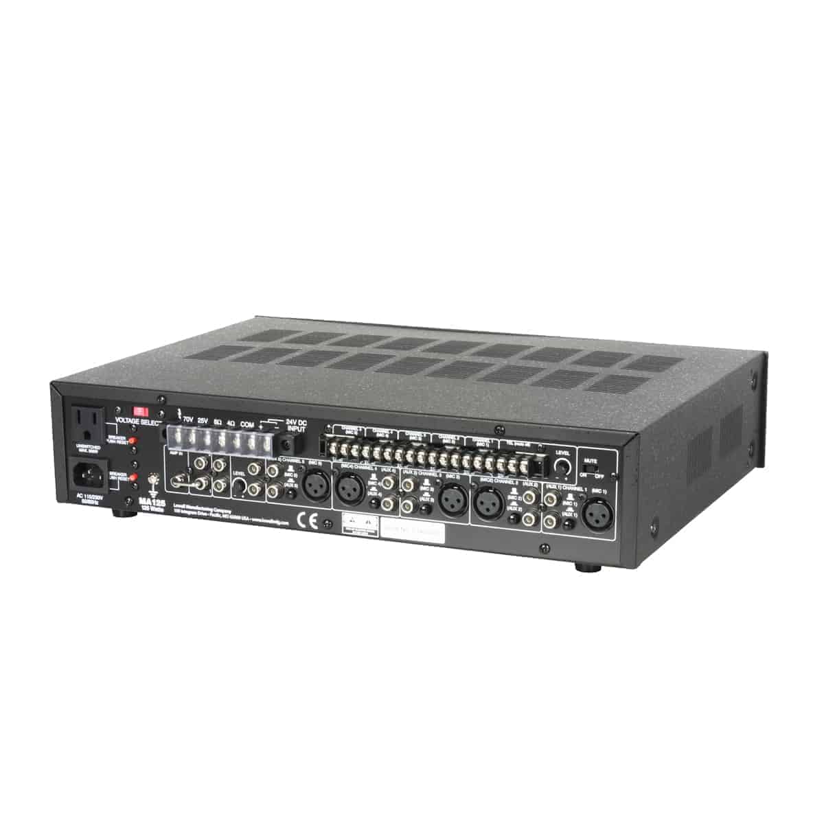 The mixer/amplifier shall be Lowell Model MA125 which shall have a 125W power amplifier with 4 ohms, 8 ohms, 25V and 70V speaker outputs at a screw terminal. It shall feature five input channels switchable from XLR mic connector to AUX input dual combining RCA-phono connectors, AUX-6 input channel with dual combining RCA-phono connectors, telephone input, dual RCA-phono parallel tape-out connectors, and dual RCA-phono parallel PRE-OUT (pre-amp out) connectors. The mixer/amplifier shall include five channel volume controls, bass and treble controls, and LED display bank for output level. The unit shall measure 17 in.W x 3.5 in.H x 13.5 in.D and include brackets to mount to a 19 in. E.I.A. rack.