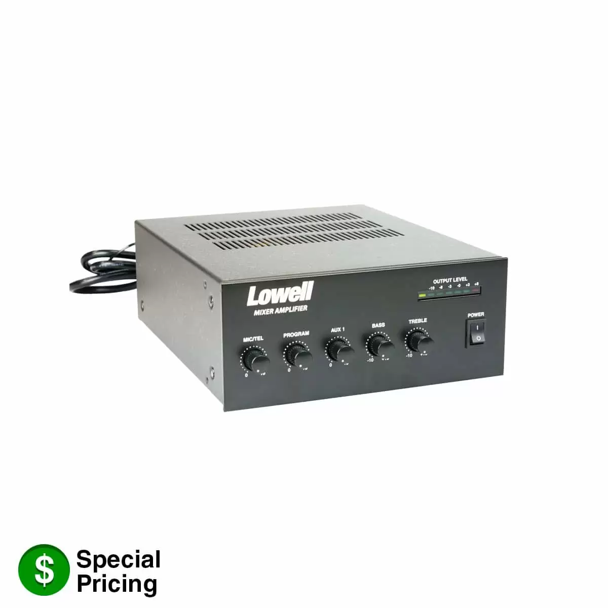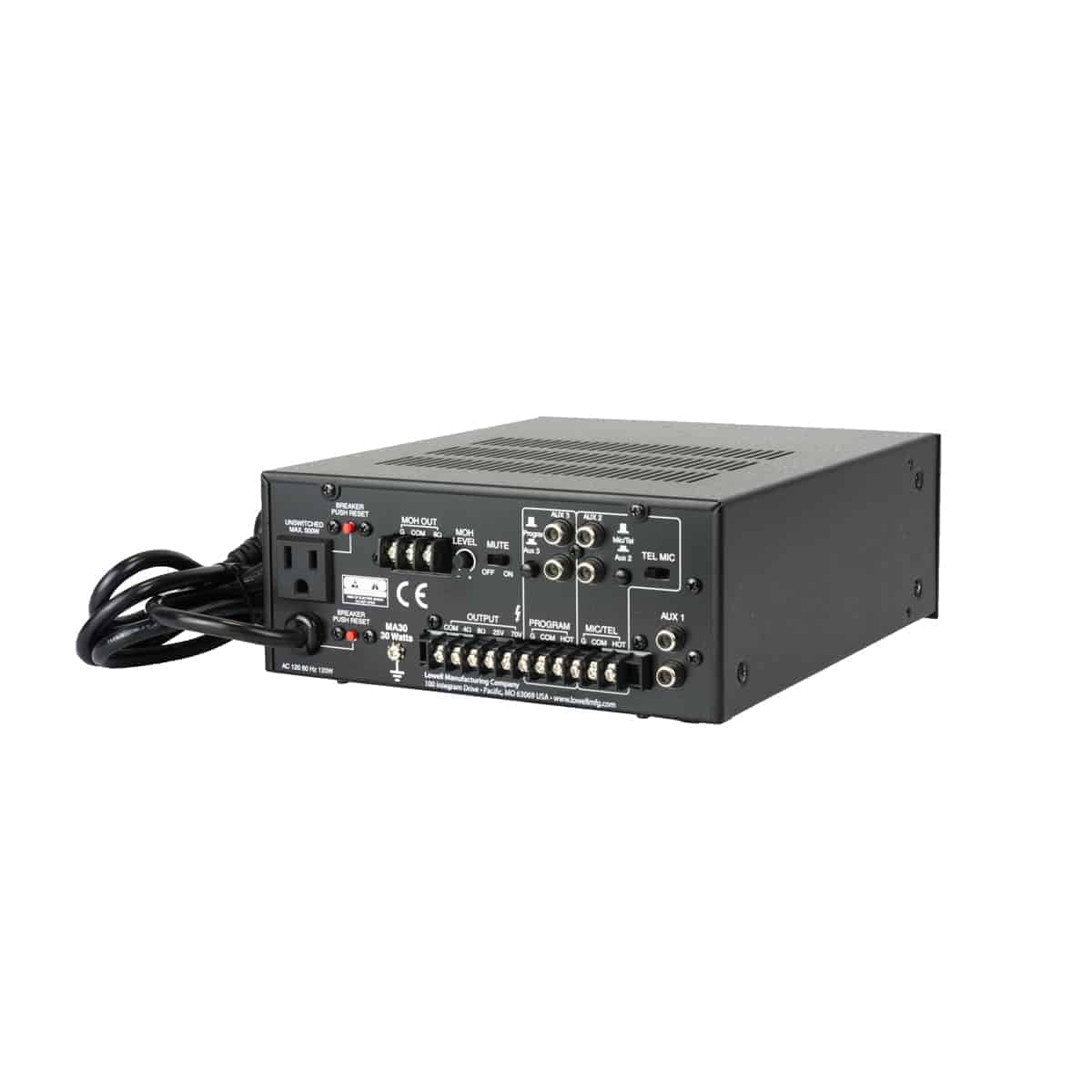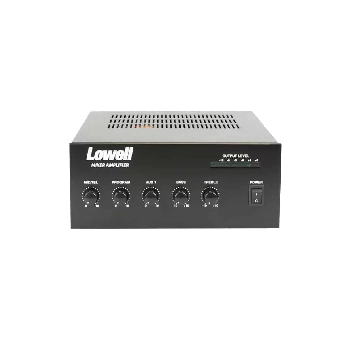 The mixer/amplifier shall be Lowell Model MA30 which shall have a 30W power amplifier with 4 ohms, 8 ohms, 25V and 70V speaker outputs at screw terminals. It shall feature three channels (microphone/telephone channel [switchable], program input channel and AUX 1 channel—dual-combining RCA/phono connectors), bass control, treble control, power active LED and output level LED. The unit shall measure 8.35 in.W x 3.46 in.H x 10.82 in.D.