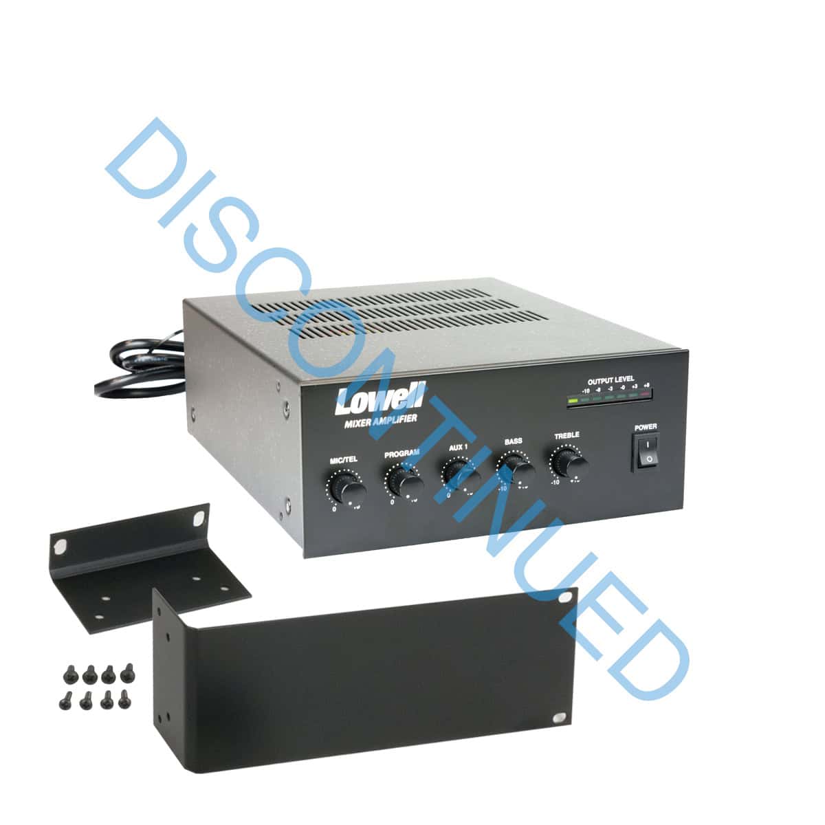 Mixer with 30W power amplifier features 4ohms, 8ohms, 25V, and 70V speaker outputs at screw terminals. Powered by 120VAC 60Hz, the main AC input is protected by a circuit breaker in back (rear receptacle is protected by a separate circuit breaker). The front panel features three input channels (MIC/TEL, PROGRAM, AUX1), plus BASS control, TREBLE control, power active LED, and output level LED. Includes rackmount brackets.