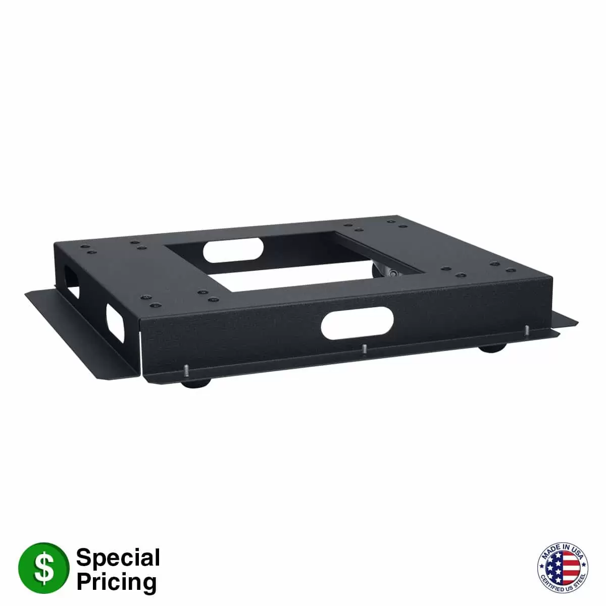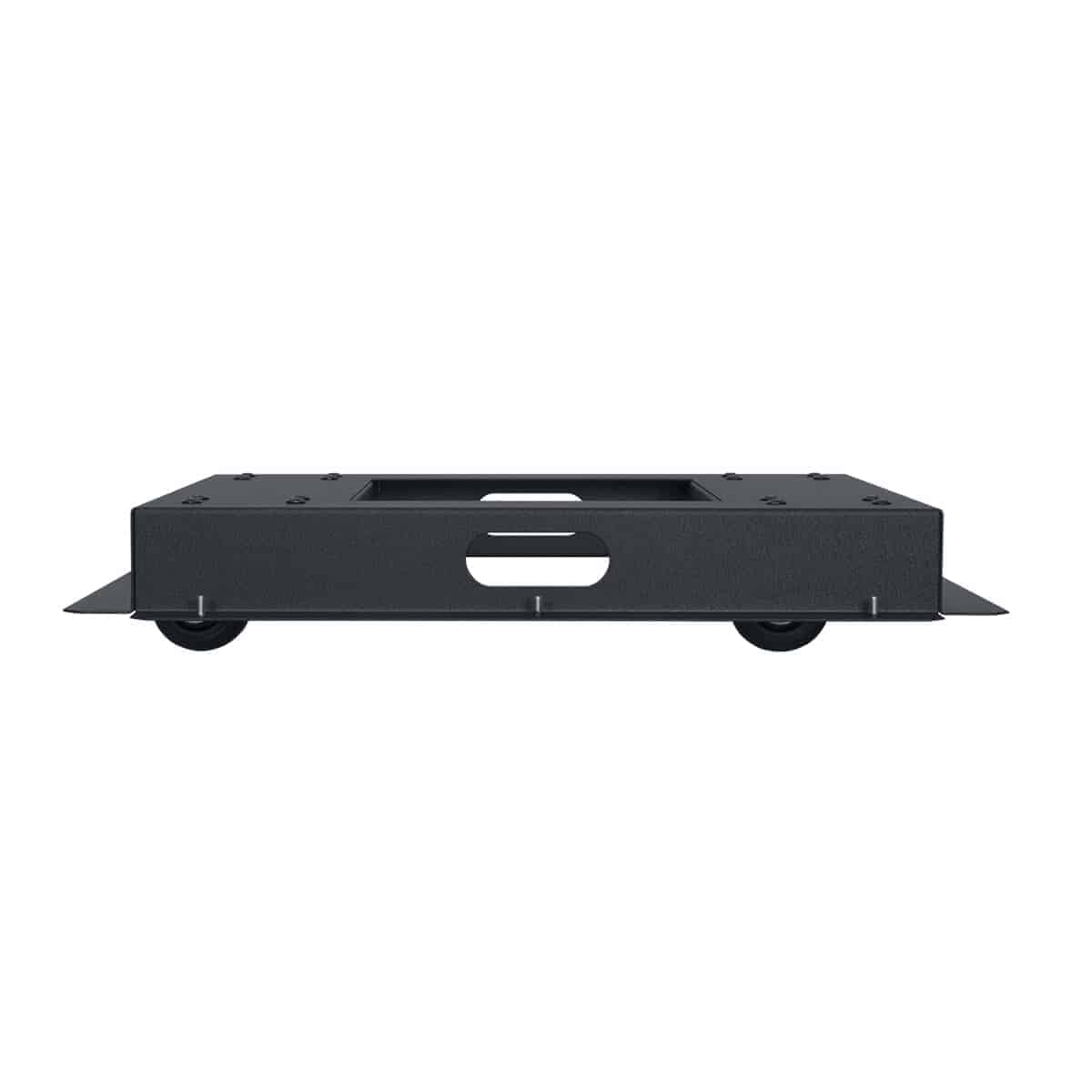 The rack’s mobile base shall be Lowell Model LMNB-27, which shall be of an inner platform design that mounts inside the rack frame, adding a floor positioned flush to bottom rack space. Construction shall be 14-gauge welded steel with a center opening and black wrinkle powder epoxy finish. Side openings for cable pass-through. Four heavy-duty (3 in.) non-locking swivel casters shall be positioned inside the platform providing a total load rating of 1400 lbs. Increase in overall rack height shall be 1.25 inches. Mounting hardware shall be included.