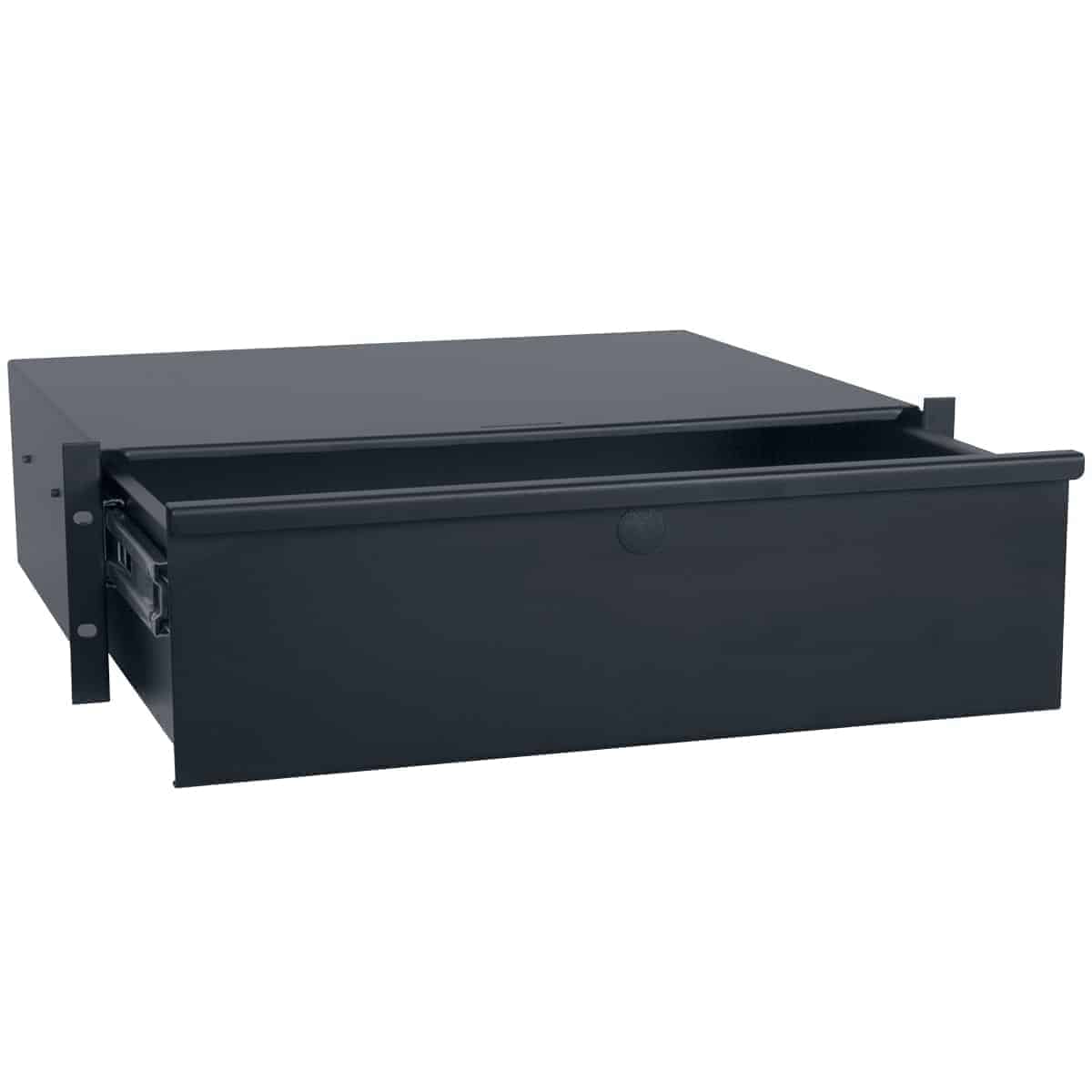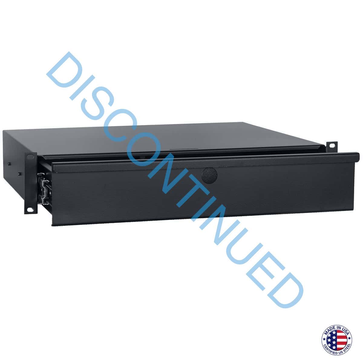 Non-locking utility drawers for use in 19-inch equipment racks are fully-welded 16-gauge steel with smooth black powder epoxy finish. Load capacity 50 lbs. Ball bearings provide smooth operation, while a rear bushing provides convenient wire access. Made in the U.S.A. The 14.5 inch deep drawer is 2U high.