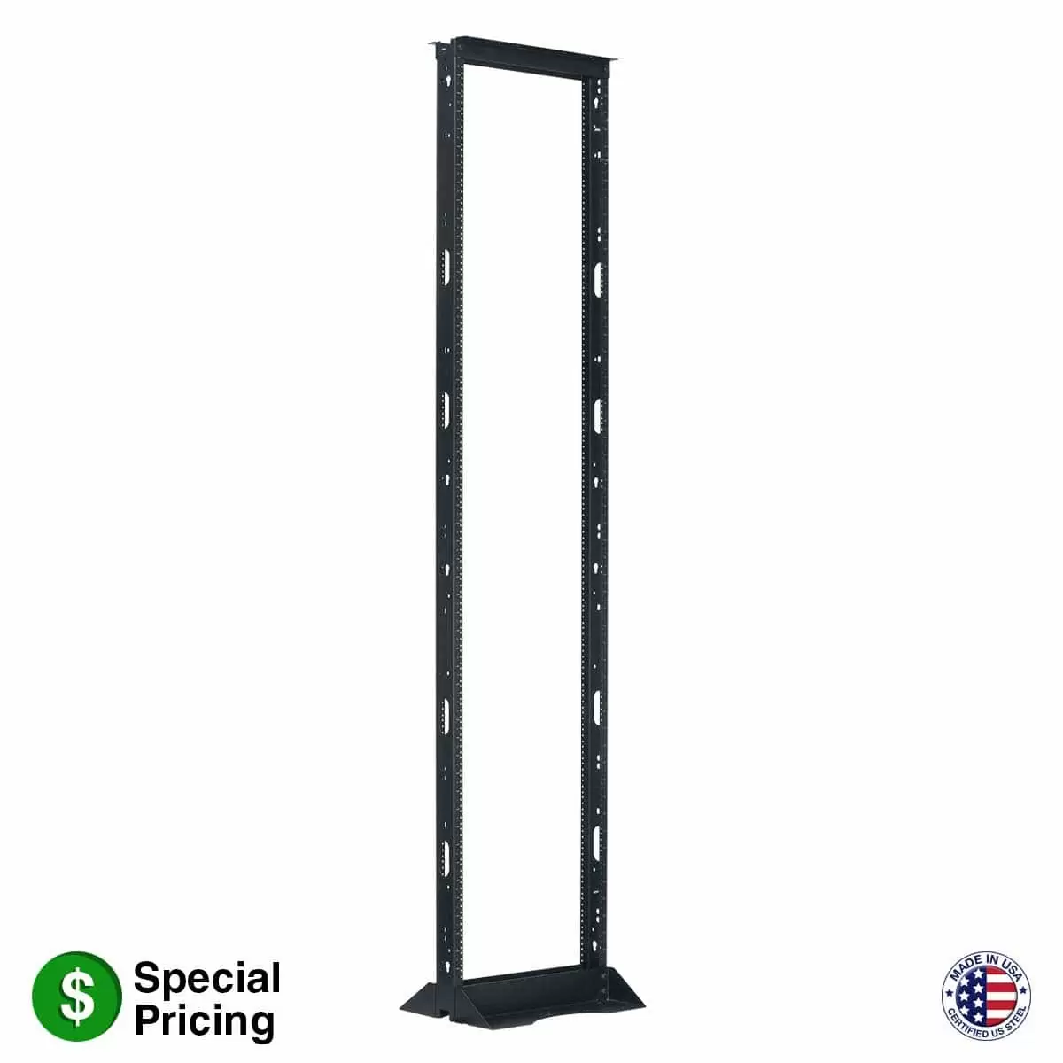 The EIA/TIA-compliant two-post networking rack shall be Lowell Model NR2P-5215, which shall measure 20.25″W x 15.00″D (at base) x 96.50″H, providing panel space of 52 rack units. Rack construction shall be a two-piece steel top and two-piece steel base, which shall feature four holes for anchoring to the floor (anchors not included). The networking rack shall include two 12-gauge steel (3″W) double-sided vertical channels with mounting holes tapped 12-24 on EIA mounting centers and feature printed RU markings. The rack shall ship unassembled and include assembly and panel mounting hardware, and ten (10) quarter-turn cable managers. The rack shall be manufactured in the USA using USA-certified steel and have a smooth-black powder-coat finish. It shall be Trade Agreement Act (TAA) compliant and Buy American Act (BAA) compliant.