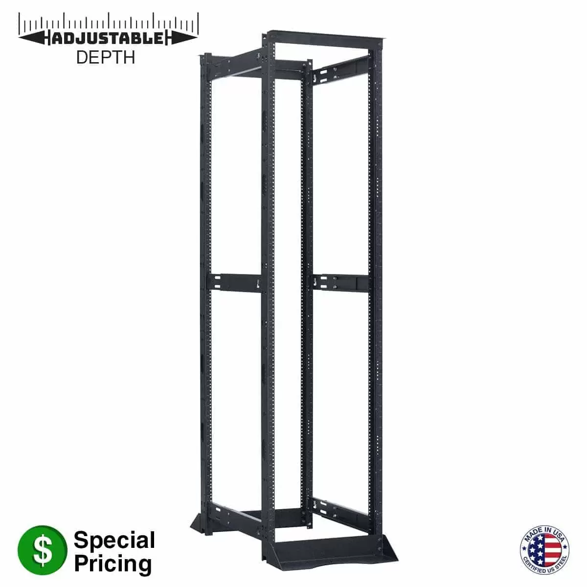 Four post networking rack provides full access to 19-inch electronics such as routers, switches, etc., while the open design provides unrestricted airflow. This model features a depth that can be adjusted from 24"D to 36"D — for projects with an undefined ideal footprint. This model features 3-inch deep channel rails and quick-install nylon plastic cable managers that can be mounted on the sides.