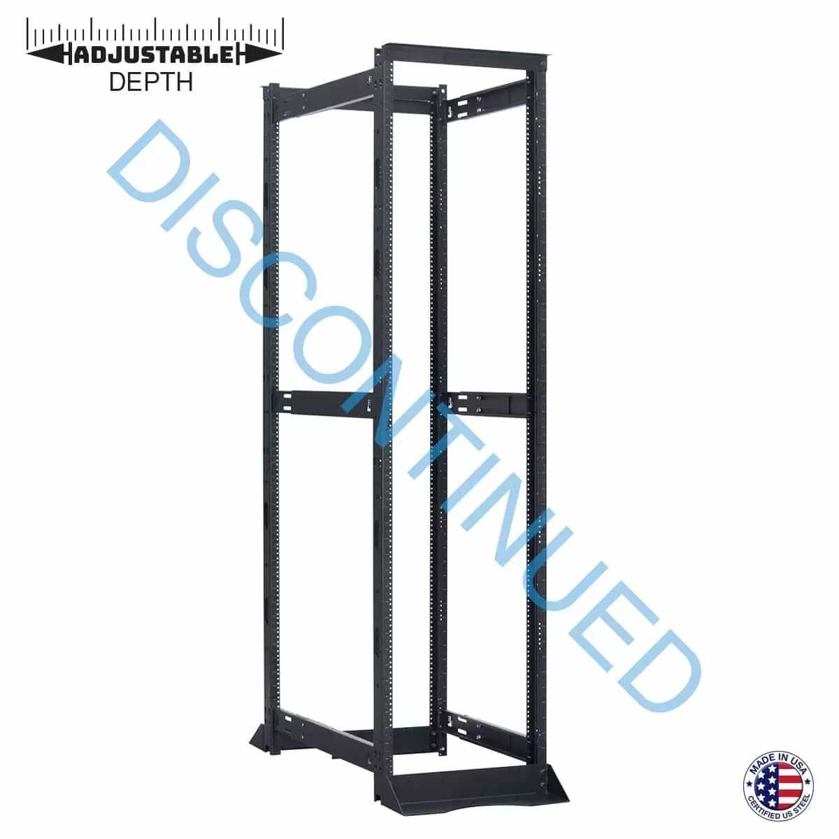 The EIA/TIA-compliant four-post network rack with adjustable depth shall be Lowell Model NR4PA-4542, which shall measure 20.25″W x 84.25″H with 45U panel space. Rack construction shall be two-piece steel top and two-piece steel base with four holes for anchoring to floor (anchors not included). The rack shall include four steel (3″D) double-sided vertical channels with mounting holes tapped 12-24 on EIA mounting centers and featuring a printed RU scale. Side supports shall be adjustable to depth of 42 in. Rack shall include quick-install nylon plastic cable managers, and assembly and mounting hardware. The rack shall be manufactured in the USA using USA-certified steel and have a smooth-black powder-coat finish. It shall be Trade Agreement Act (TAA) compliant and Buy American Act (BAA) compliant.