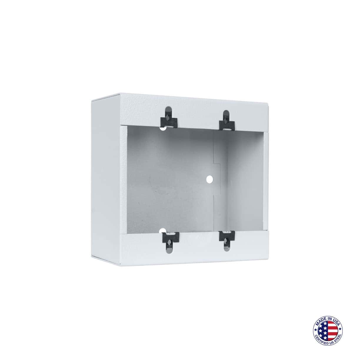 The surface-mount wall box shall be Lowell Model P1X-2, which shall be constructed of 20-gauge USA-certified steel with white powder-coat finish. The 4.63″W x 4.63″H x 2.5″D two-gang box shall feature five knockouts and front flanged holes that conform to standard wall plate centers and hardware. The box shall be Made in USA and shall be Trade Agreement Act (TAA) and Buy American Act (BAA) compliant. It shall include four 6-32 U-clips.
