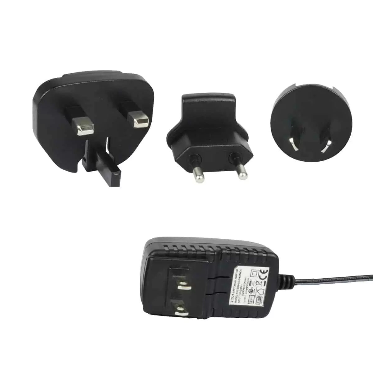 The power supply shall be Lowell Model No. PS2405, which shall include four plug adaptors — NEMA 1-15 for use in North America, CEE 7/16 for use in central Europe, BS 1363 for use in the U.K. and AS 3112 for use in Australia/New Zealand. The power supply shall have input of 100-240 VAC 50/60Hz (0.5A max.). The output shall be 24 VDC (500mA).