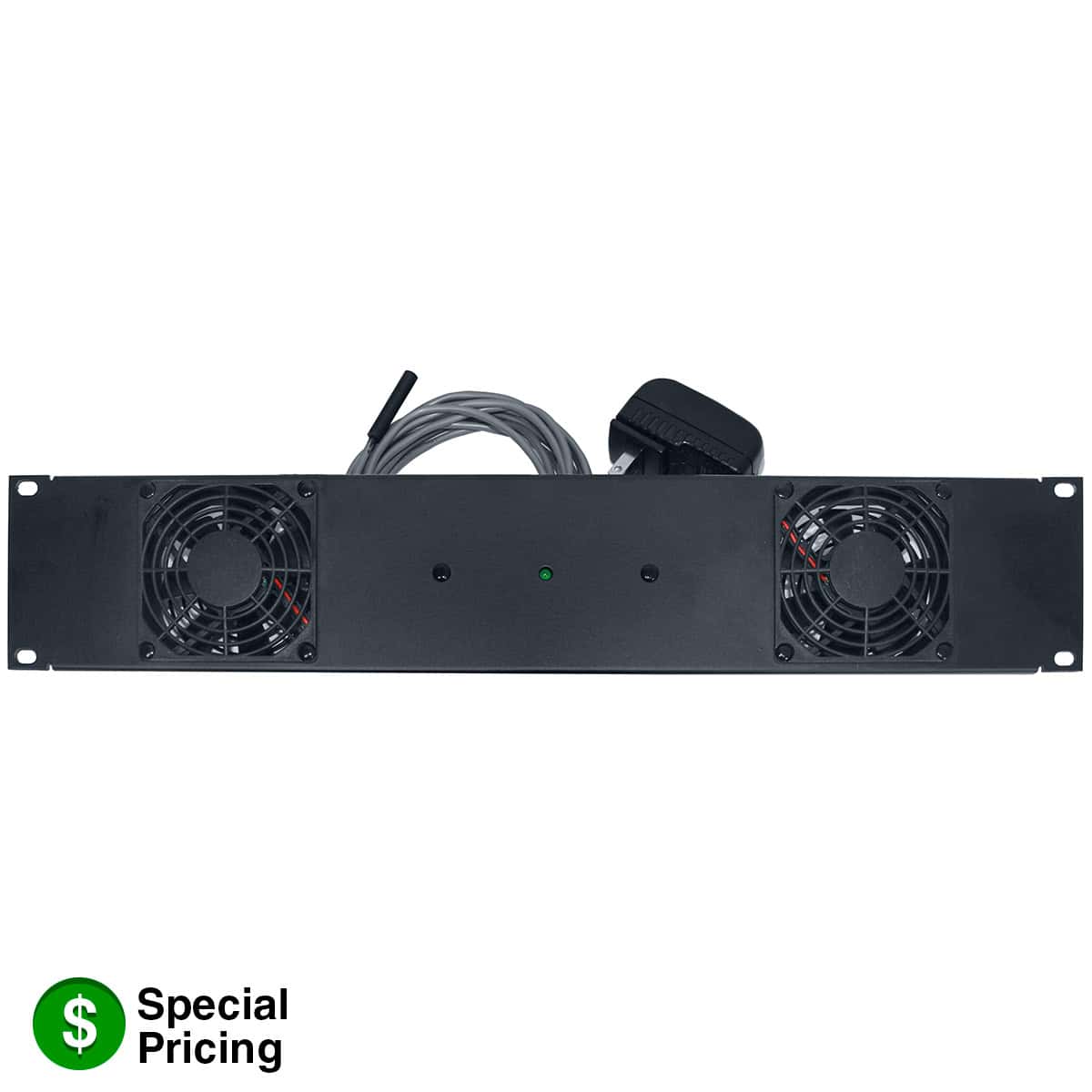 The fan panel for rackmount installation shall be Lowell Model FDC2-2T which shall be U.S. steel finished in black powder epoxy paint with mounted fans and fan guards. The panel shall measure 2U x 19 in.W and include 2 fans. Each fan shall have a 3.5 in. dia., and provide 52cfm airflow with 26dB noise rating when operating at highest speed. The fan panel shall include universal power supply and four plug adaptors (NEMA 1-15, Schuko CEE 7/16, BS1363 and AS3112). The fan panel shall include a variable-speed thermostat probe to automatically activate fans, increasing and decreasing speed according to ambient temperature.