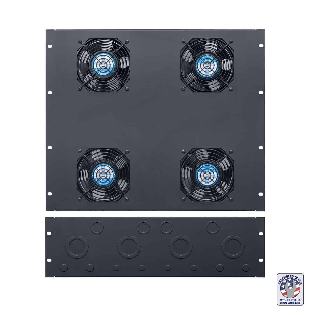 The rack shall include Lowell rack top model RTK-2 which shall include a cable knockout panel and four fan panel. The cable knockout panel shall measure 3U x 19″W and feature combination knockouts for cable management. The fan panel shall be 16-gauge steel panel with black powder coat finish. It shall measure 9U x 19″W and include 4 whisper fans with fan guards. Each fan shall have a 4.7″ diameter with 50 cfm airflow and 28 dBA noise rating. The unit shall include a 6-ft. cord with plug. The cord shall be green and shall feature an integral thermostat probe to automatically control fan activation. The whisper fan panel shall be assembled in the U.S.A. with certified U.S. steel and global components.