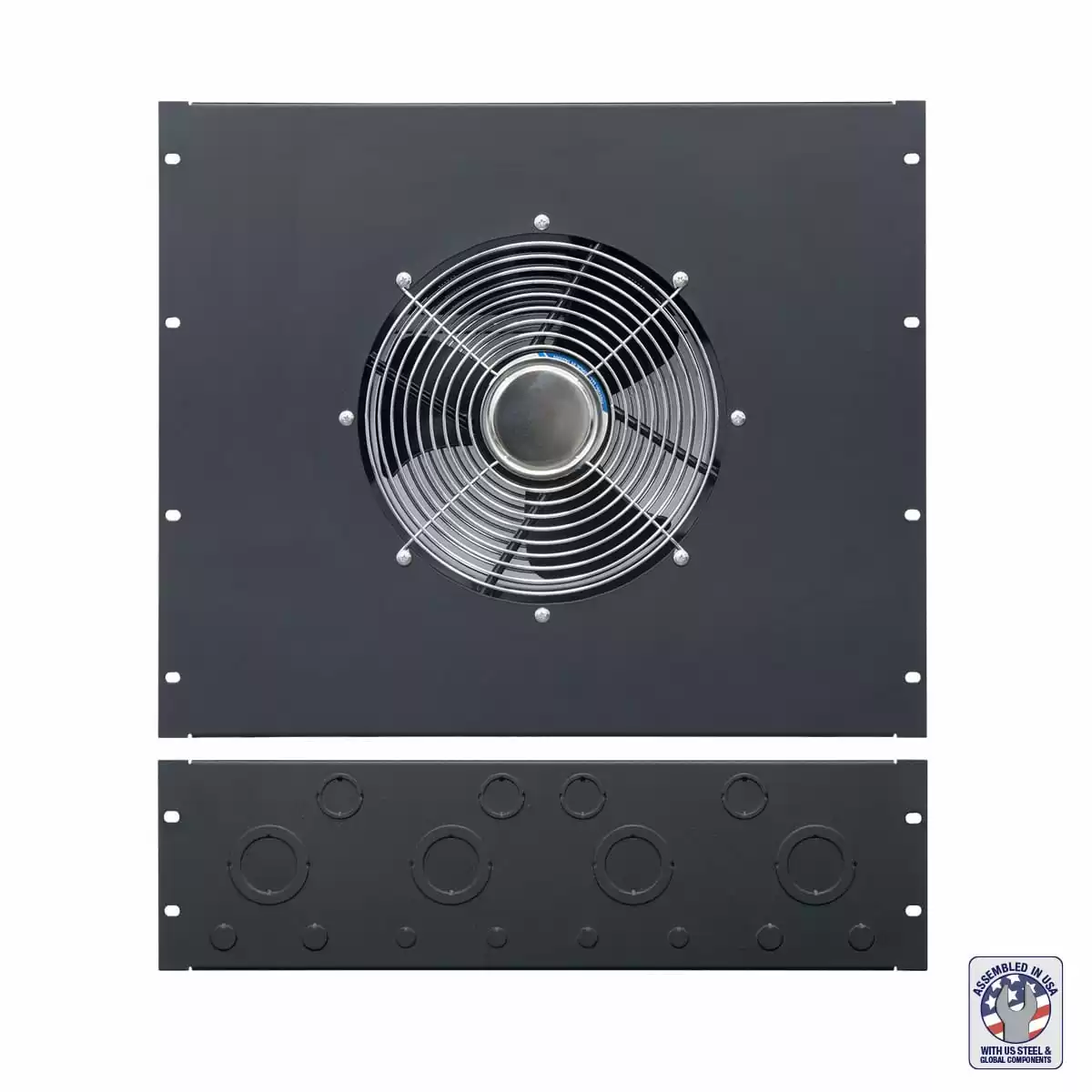The rack shall include Lowell rack top model RTK-3 which shall include a cable knockout panel and turbo fan panel. The cable knockout panel shall measure 3U x 19″W and feature a series of combination knockouts for cable management. The fan panel shall be 16-gauge steel with black powder coat finish. It shall measure 9U x 19″W with a 10″ x 3.75″D tubeaxial fan, which shall include front and rear fan guards. The fan shall provide 550 cfm airflow and have a 50.8 dBA noise rating. The unit shall include a 6-ft. cord with plug. The cord shall be green and shall feature an integral thermostat probe to automatically control fan activation. The turbo fan panel shall be assembled in the U.S.A. with certified U.S. steel and global components.
