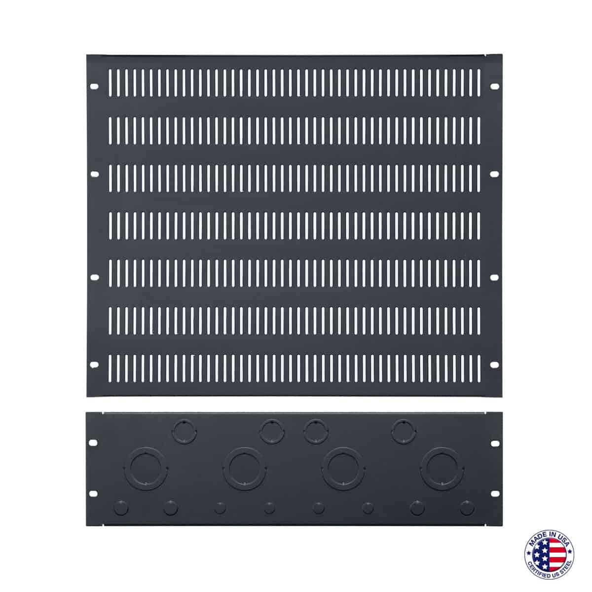The rack shall include Lowell rack top model RTK-4 which shall include a cable knockout panel and solid blank panel. The cable knockout panel shall measure 3U x 19″W and feature combination knockouts for cable management. The vent panel shall feature obround slots for ventilation, measure 9U x 19″W, and feature a 0.50″ flange. The rack top shall be made in the U.S.A. with certified 18-gauge U.S. steel and have a black powder coat finish.