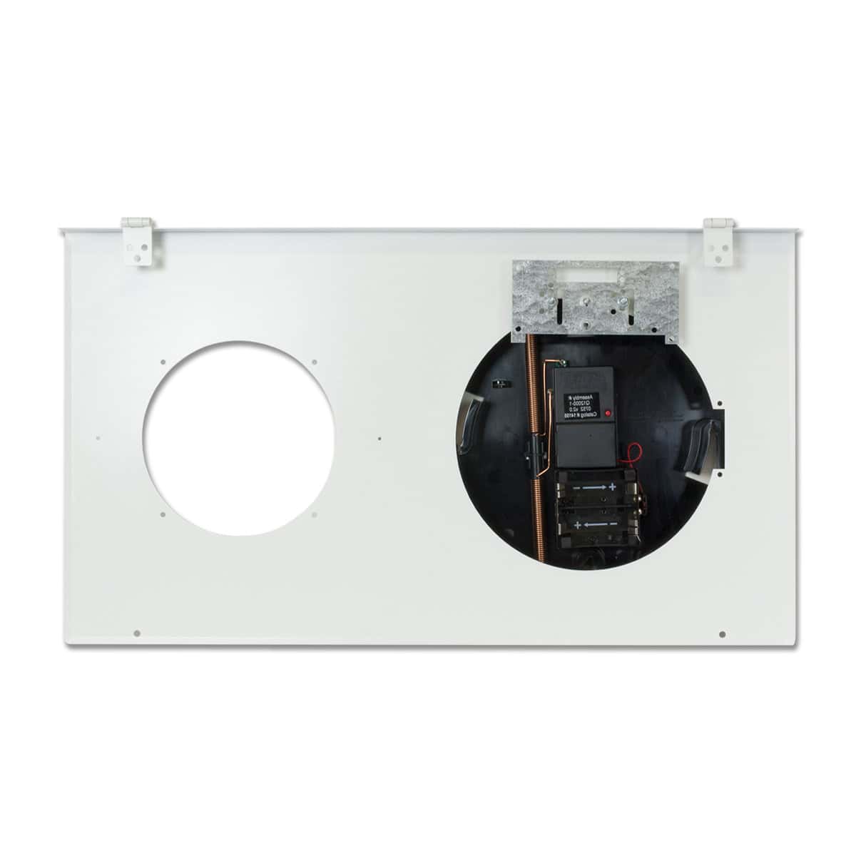 The grille/panel for the clock/speaker center shall be Lowell Model BP-300-LFT. It shall be 18-gauge steel and measure 27.25 in. x 17 in. It shall feature a solid face plate panel with cutouts for a clock and speaker, mounting hardware for round bezel grille and 8 inch speaker (ordered separately), and a universal clock-mounting bracket with hardware for horizontal (left side) or vertical (at top) installation of a standard 12 inch analog clock (by others). The grille assembly shall be finished in white powder epoxy and include hinges and screws for installation to recessed backbox Model PC312 (ordered separately).