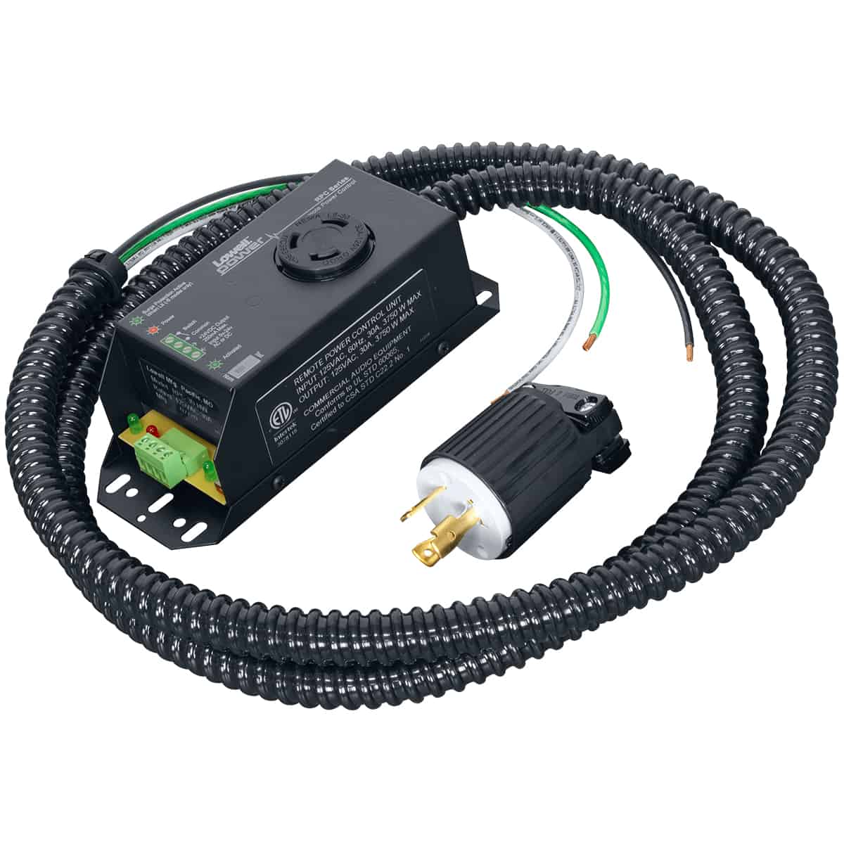 RPC Series Remote Power Control uses classic style connections, and is ready to combine with a variety of switches or sequential control devices that provide a dry contact closure or voltage output (5V-24V AC or DC 5mA) for an intrinsically safe low voltage method of controlling AC power to activate and deactivate equipment at a remote location. Model RPC-30-SHW features one 30A outlet, surge suppression and hardwired termination. This unit requires an external trigger for activation.