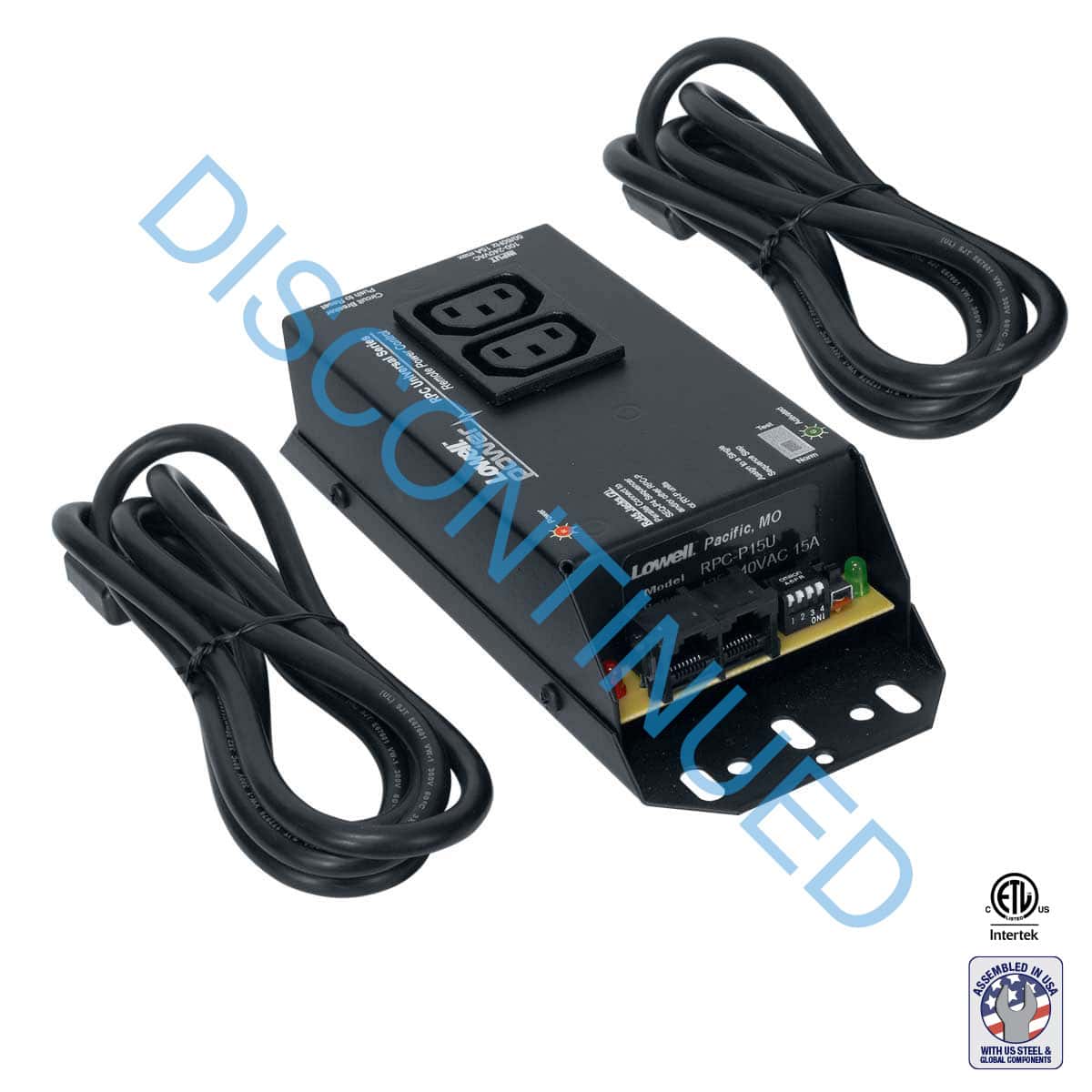 The device for remotely controlling AC power shall be Lowell model RPC-P15-U, which shall be a 8.00″L x 3.25″W x 1.95″ steel chassis with black powder epoxy finish. The remote power control shall feature RJ45 jacks and C13 duplex power outlet. Power rating shall be 100-250VAC. Power input shall be via 6 ft. cord.