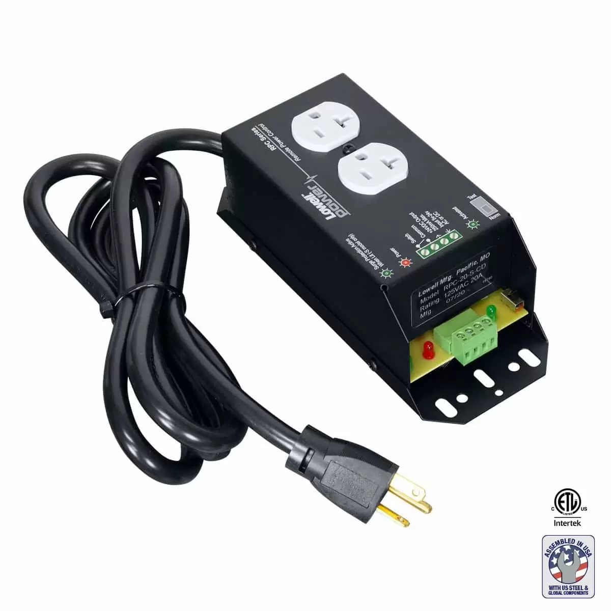 The device for remotely controlling AC power shall be Lowell Model No. RPC-20-SCD, which shall include a power supply and relay housed in a 8.00 in. x 3.25 in. x 2.75 in. steel chassis. The unit shall include one duplex outlet with 20A power rating and 6-ft. cord with NEMA 5-20P plug termination. It shall also include basic surge protection up to 20,000A. The unit shall be manufactured in the USA using USA-certified steel and have a smooth-black powder-coat finish. It shall be ETL Listed, Trade Agreement Act (TAA) compliant and Buy American Act (BAA) compliant.
