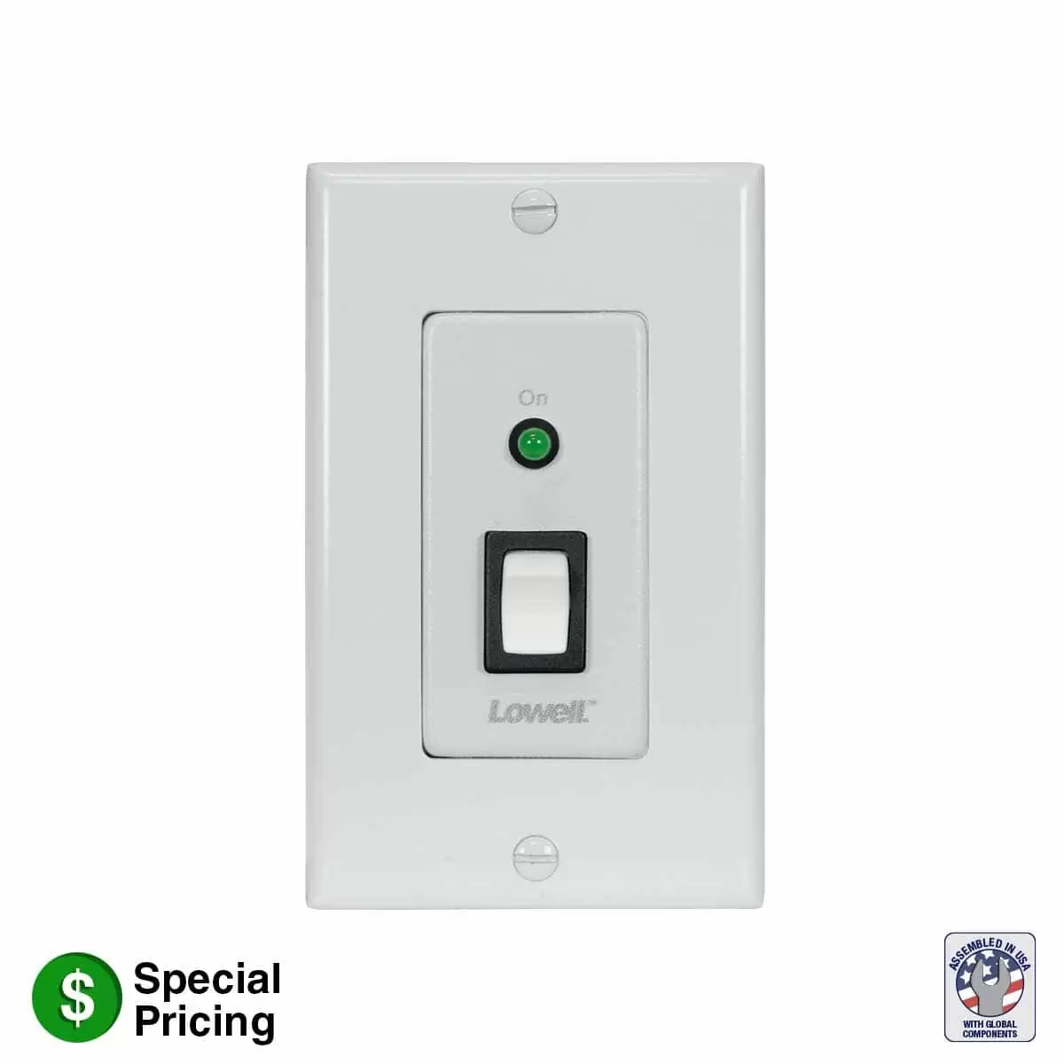 Low voltage switch (SPST) with maintained closure for single switch applications includes white decorator wall plate, rear termination strips and a single RJ45 jack to connect a compatible Lowell remote power control (RPC) or sequencer (SEQ) for equipment activation. Note: Check spec sheet to ensure switch compatibility.