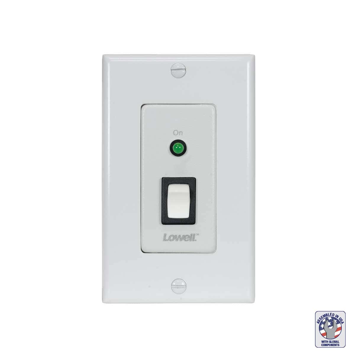 Low-voltage switch (SPST) with maintained closure for single switch applications includes white decora-style wall plate and rear termination strips to connect a compatible Lowell remote power control (RPC) or sequencer (SEQ) for equipment activation. Note: Check product spec sheet to ensure switch compatibility.
