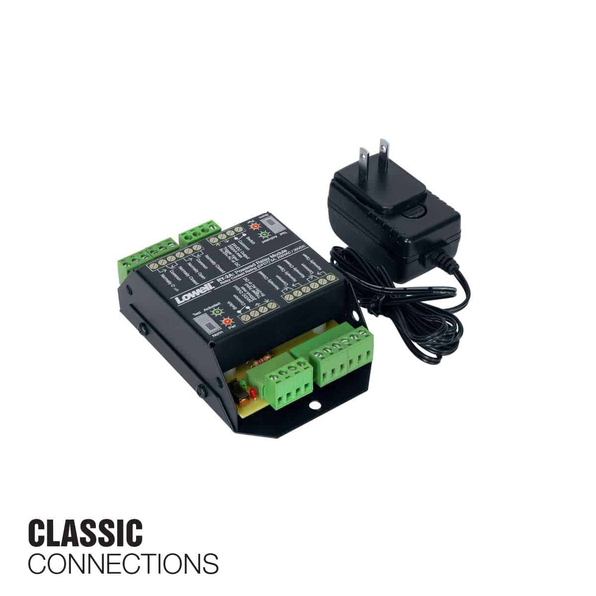 The general purpose relay module features two double-pole double-throw (DPDT) relays and serves a wide variety of applications. Each relay is independent. The enclosed design protects relays and components. Relays are activated by contact closures or voltage input (5-24V AC or DC). Phoenix-style terminals are detachable.
