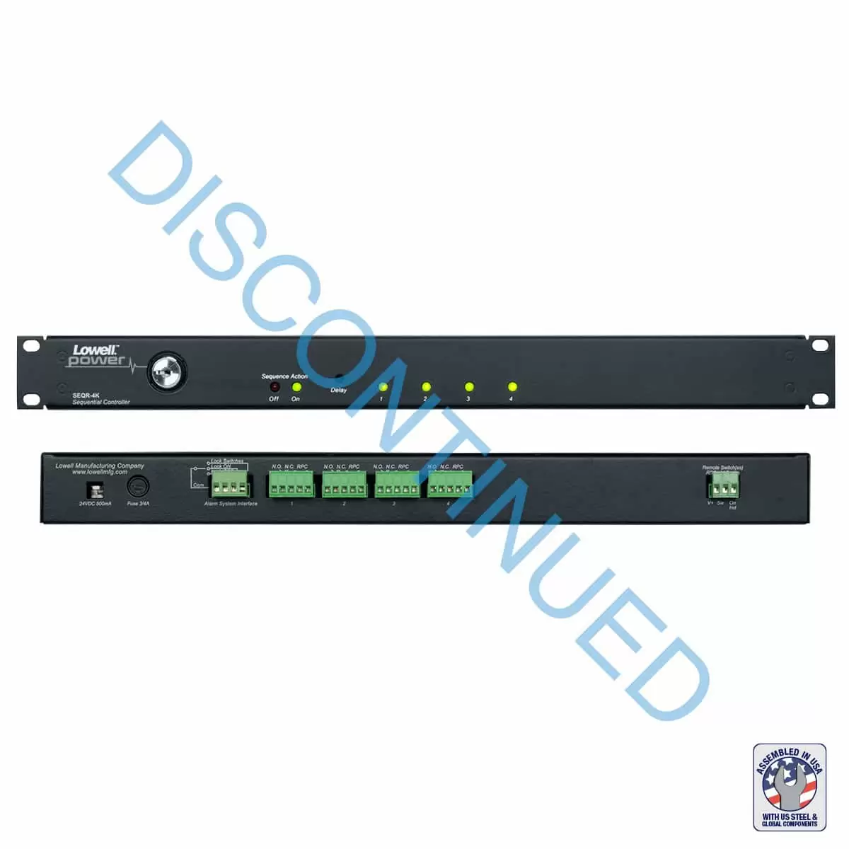 The device for sequentially activating equipment shall be Lowell rackmount Model No. SEQR-4K, which shall feature front key actuation switch, LEDs and accessible trim pot for 4- step delay adjustment of sequence operation. The rear panel shall feature four barrier strip terminals for remote power control units and dry auxiliary contacts for accessory devices. Equipment to be controlled shall be connected to the sequencer using 2-conductor wire and Lowell Remote Power Control No. __________ (RPC Series, order separately). The rear panel shall include contacts for connecting an optional momentary style switch No. __________ (RPSW-M or RPSB-M Series, order separately) for remote operation of the sequence controller. The unit shall be equipped with an alarm interface for use where required by local building code.