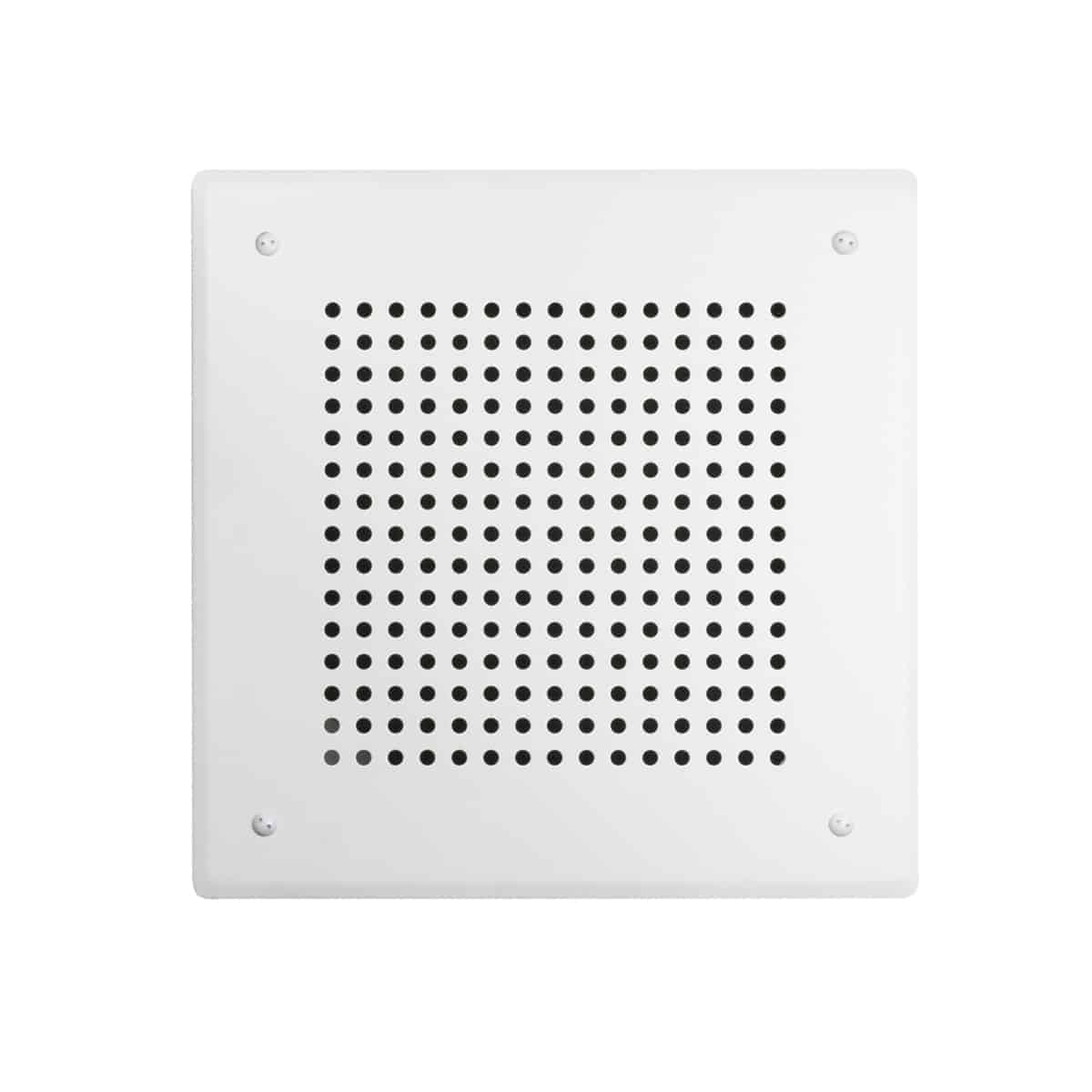 The square vandal-resistant grille for 8-inch speakers or (Unihorn Model LUH-15T) shall be Lowell Model SG-8VP. It shall be heavy duty 14-gauge punched steel reinforced with a peripheral flange. It shall include a 22-gauge steel barrier screen, painted black, and a chipboard gasket to protect the driver from damage. The grille shall be 11.438 in. square with a shallow mounting projection of 0.125 in. It shall have 8-32 x 1 in. welded studs with nuts for mounting specified 8-inch EIA speaker. Each grille shall also have four 0.218 in. holes on a 9.062 in. centers for mounting specified recessed or surface backbox using tamper-resistant white screws provided. Grille shall be finished in white powder coat.