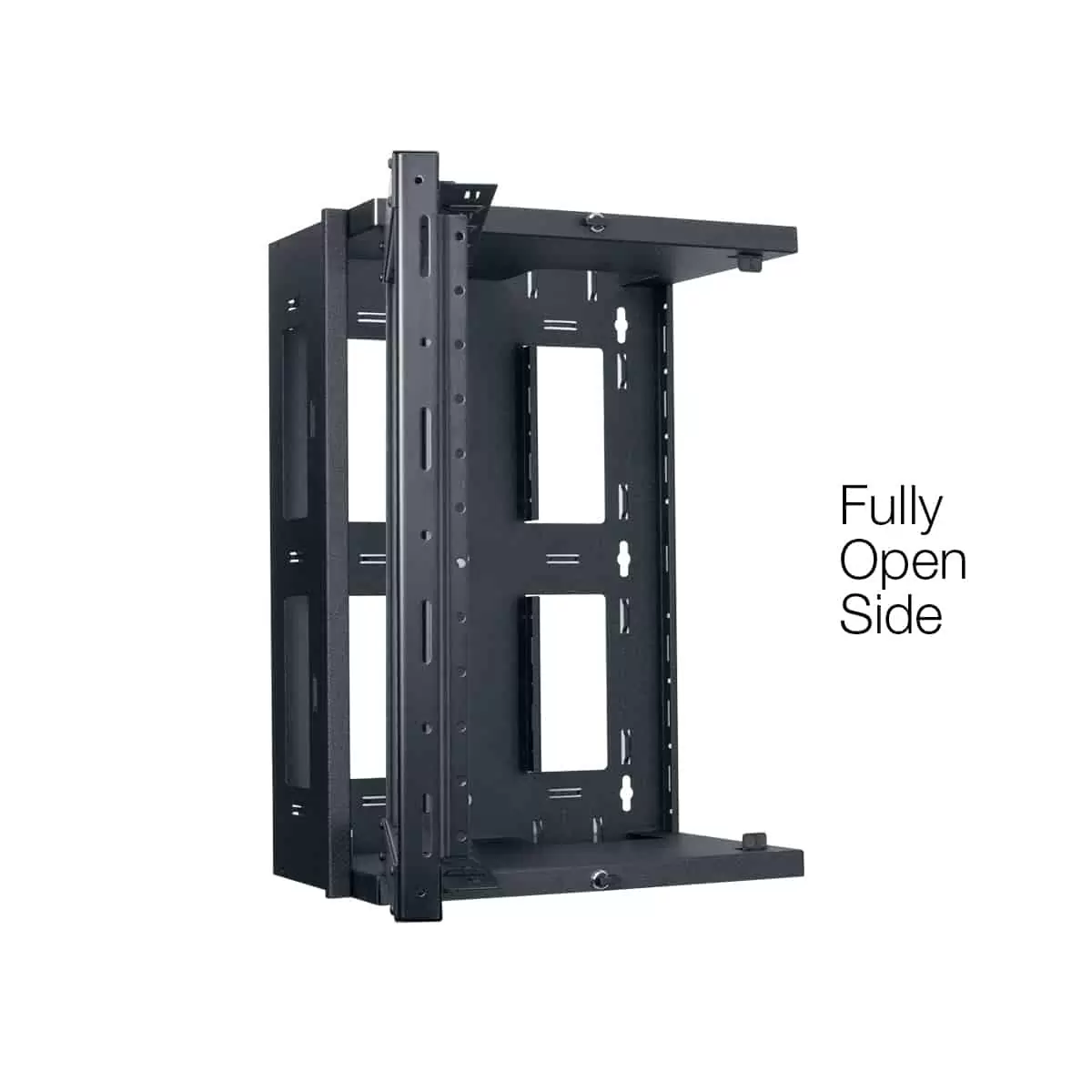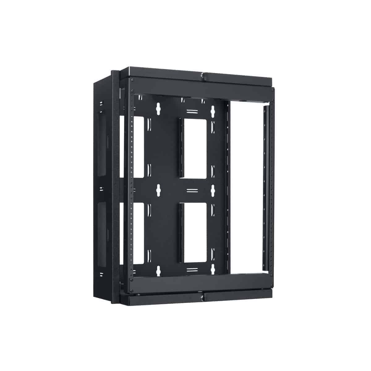 The swing gate wall rack shall be Lowell Model SGR–1212 which shall measure 27.48″H x 20.03″W x 13.21″D, which shall be constructed of heavy-gauge steel with combination textured- and smooth-black powder-coat finish. It shall feature one fully-open side and a swing gate that shall open 90 degrees to access mounted equipment. A thumb latch shall secure the frame closed. The rack shall provide 12 rack units of panel space and include cable paths, tie points, and one-pair of fixed position mounting rails tapped 10-32. Load capacity shall be 150 lbs. The rack shall be manufactured in the USA using USA-certified steel. It shall be Trade Agreement Act (TAA) compliant and Buy American Act (BAA) compliant.