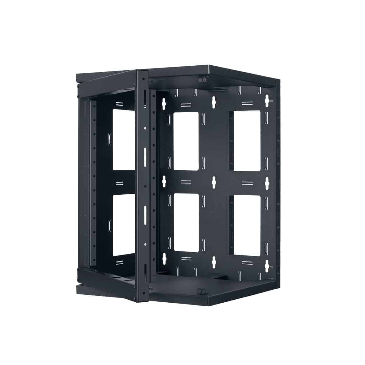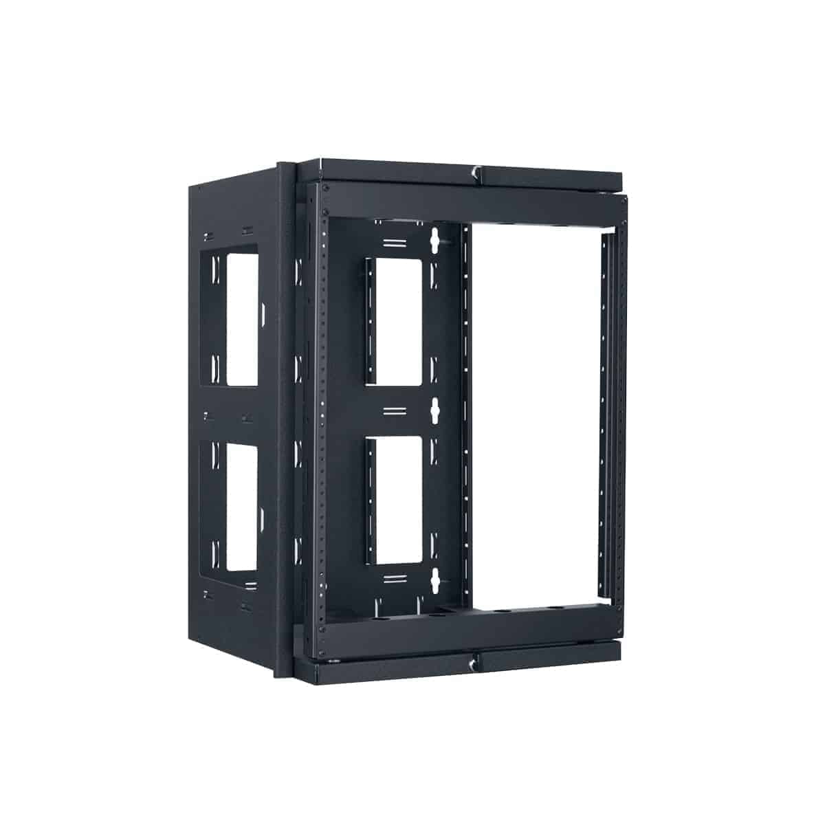 The swing gate wall rack shall be Lowell Model SGR-1218 which shall measure 27.48″H x 20.03″W x 19.00″D, which shall be constructed of heavy-gauge steel with combination textured- and smooth-black powder-coat finish. It shall feature one fully-open side and a swing gate that shall open 90 degrees to access mounted equipment. A thumb latch shall secure the frame closed. The rack shall provide 12 rack units of panel space and include cable paths, tie points, and one-pair of fixed position mounting rails tapped 10-32. Load capacity shall be 150 lbs. The rack shall be manufactured in the USA using USA-certified steel. It shall be Trade Agreement Act (TAA) compliant and Buy American Act (BAA) compliant.