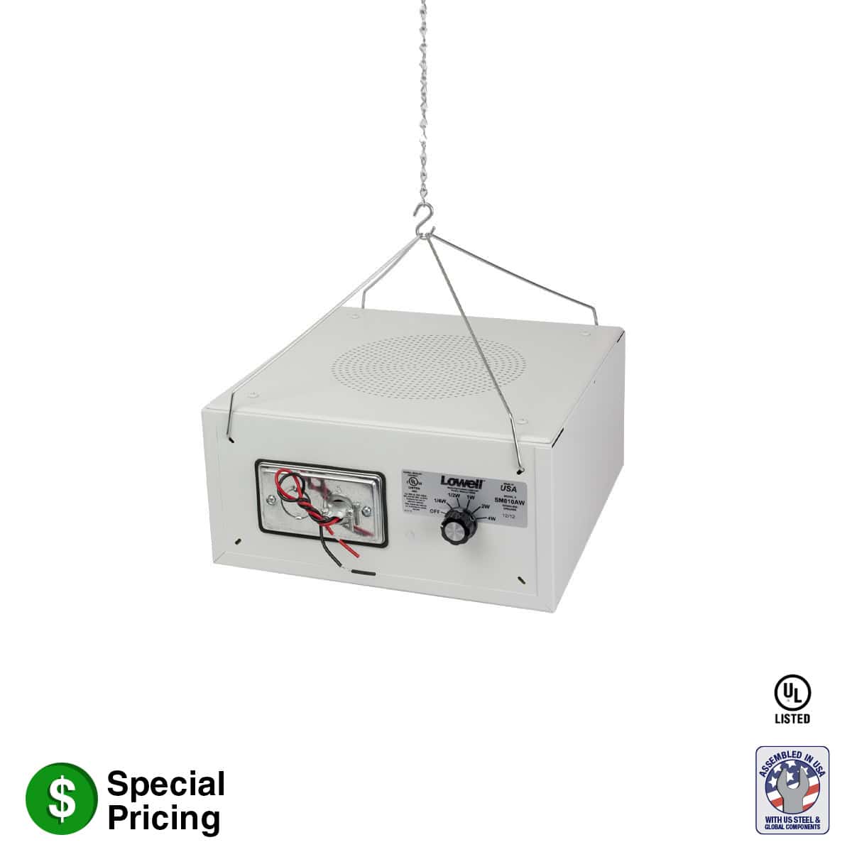Above ceiling 15W sound masking speaker with 8-inch dual cone driver, 70V transformer, grille and enclosure. Includes wire hangers, S-hooks and chain. Note: This model has an enclosure with white powder epoxy finish and is made to order.