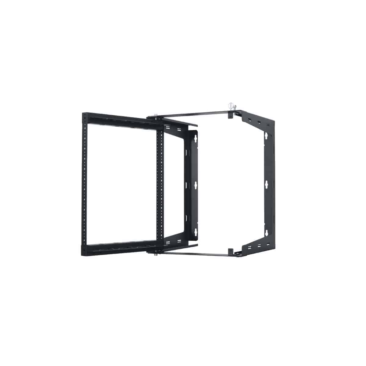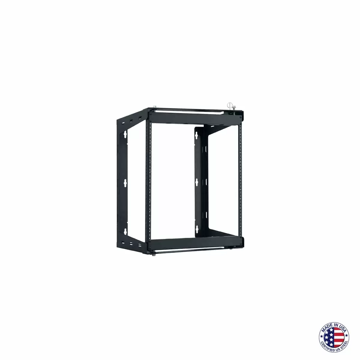 The swing gate wall rack shall be Lowell Model SR-1218, which shall measure 26.24″H x 19.75″W x 18.00″D (closed position). It shall be constructed of heavy-gauge steel. The front frame shall swing open 90 degrees (left or right orientation) to allow access to the rear of mounted equipment. The rack shall feature 12 rack units of panel space, quick release detent pins to secure the frame closed, tie loop points, and one-pair of fixed position mounting rails tapped 10-32 on EIA spacing. Load capacity shall be 100 lbs. The rack shall be manufactured in the USA using USA-certified steel and have a smooth-black powder-coat finish. It shall be Trade Agreement Act (TAA) compliant and Buy American Act (BAA) compliant.