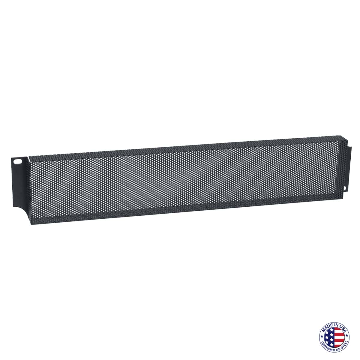 Security cover for equipment mounted in a 19-inch rack is steel construction with perforated vent pattern. The cover is made to mount in the same holes as the mounted electronics, preventing access to controls.