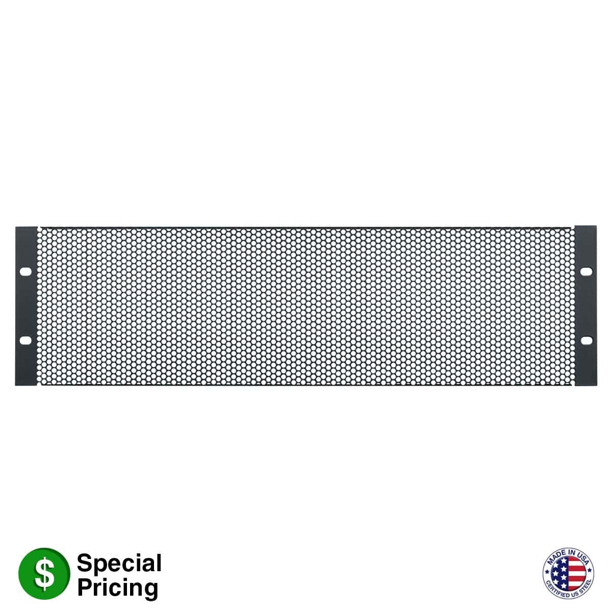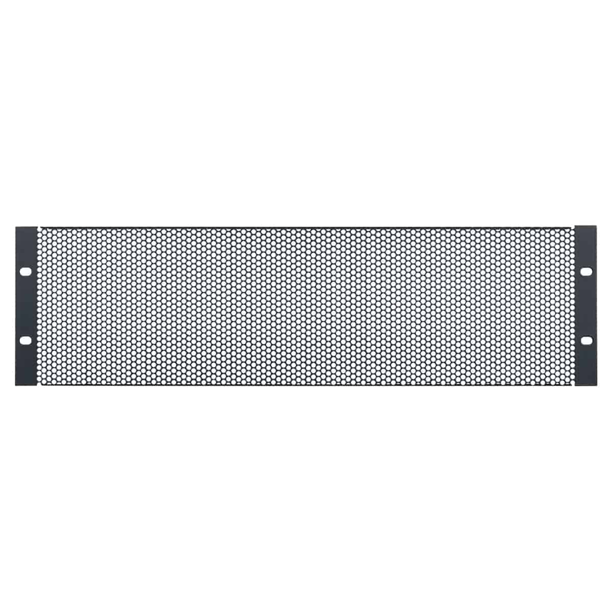 The steel vent panel with black powder epoxy finish mounts in 19-inch equipment racks. Panel features large staggered holes for passive ventilation (63 percent open area).