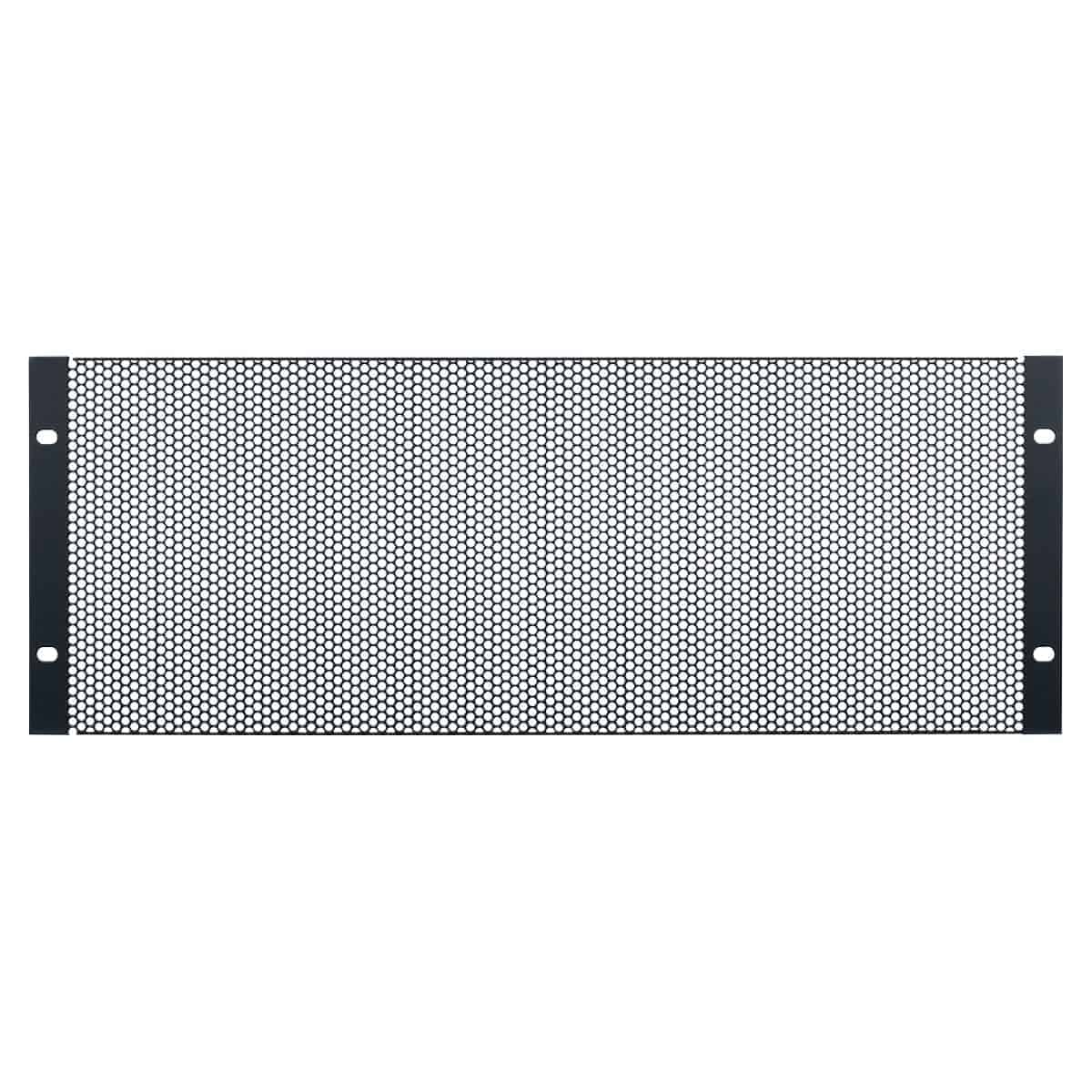 The steel vent panel with black powder epoxy finish mounts in 19-inch equipment racks. Panel features large staggered holes for passive ventilation (63 percent open area).