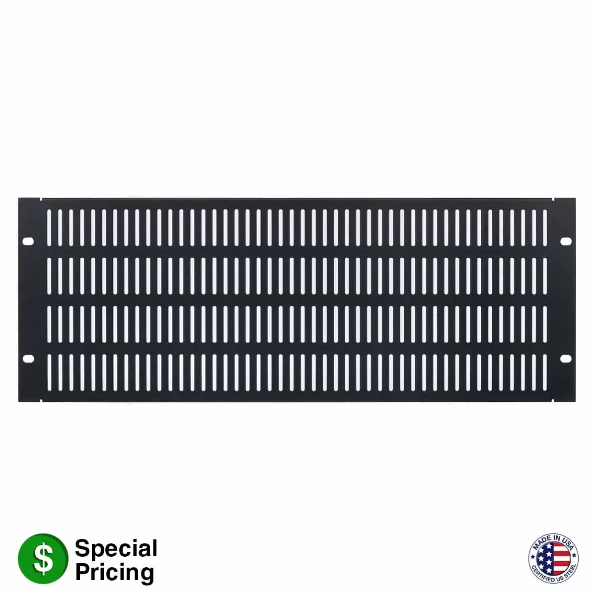 Nineteen inch steel vent panels with smooth black powder epoxy finish feature slots for passive ventilation.