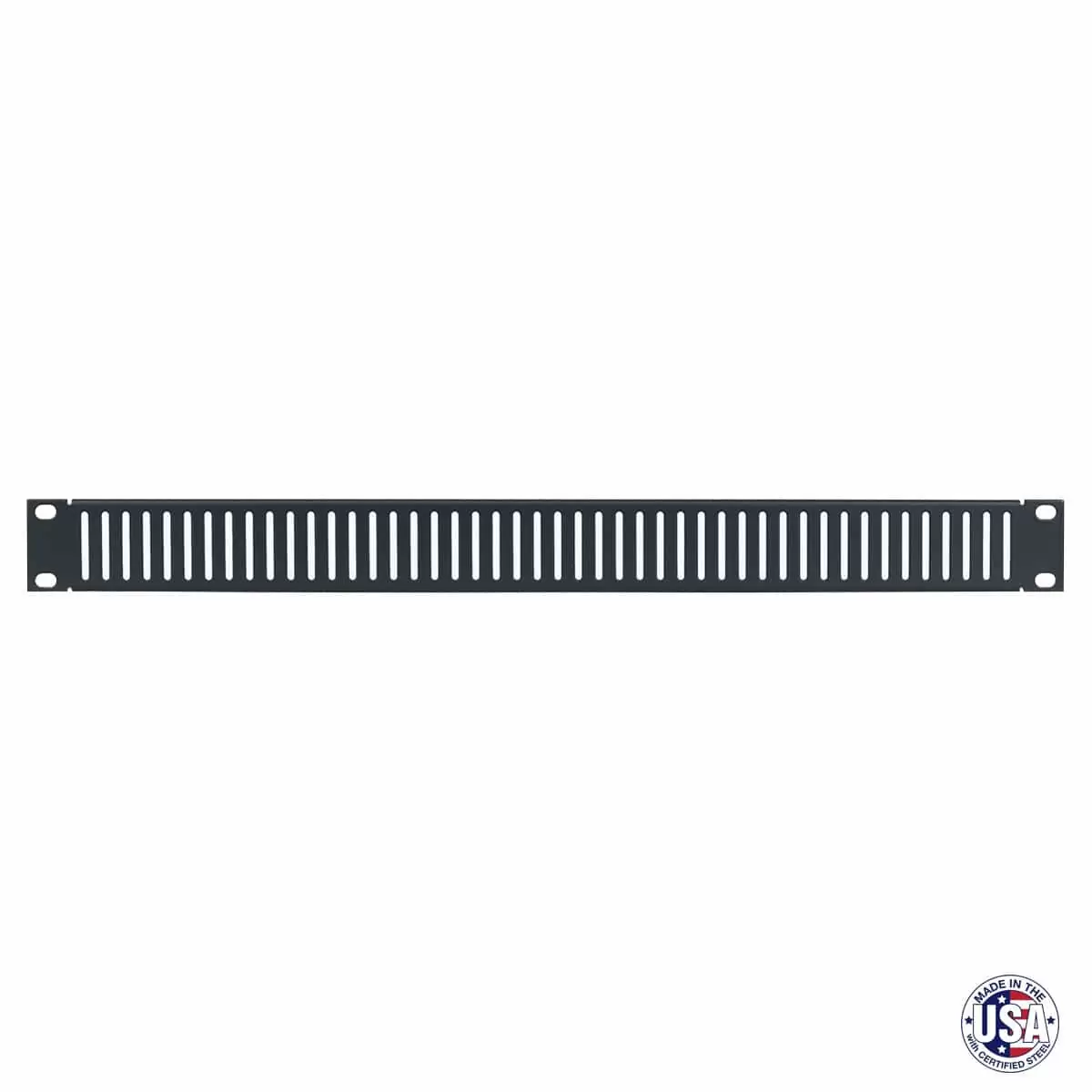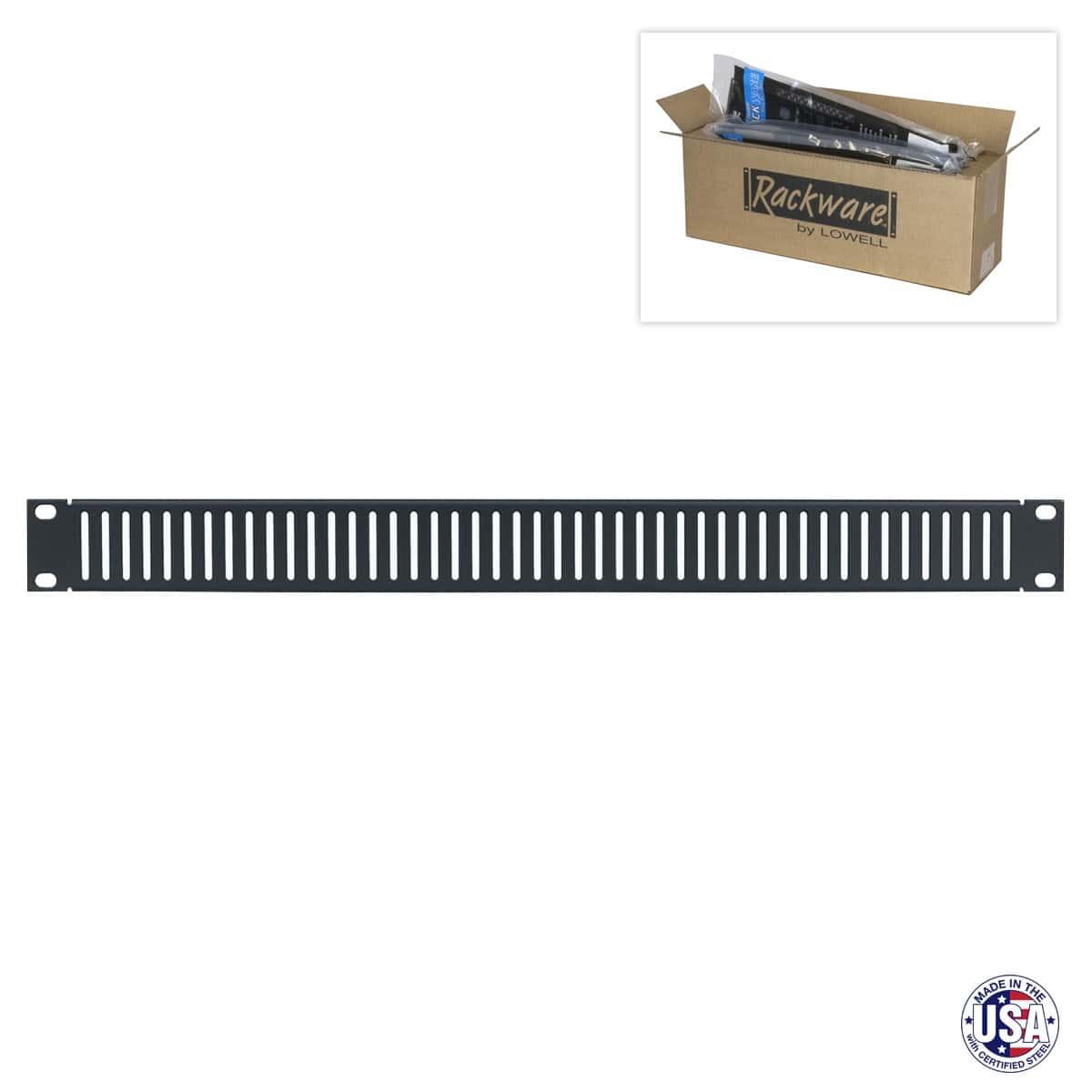 The rack vent panel shall be Lowell Model No. SVSP-7, which shall be 18-gauge steel. It shall measure 19″W x 7 RU and have a .625″ flange. The panel shall feature 1.25″ x .125″ obround slots on .375″ centers to allow passive ventilation. The panel shall be Made in USA using USA-certified steel with smoot-black powder-coat finish. It shall be ETL Listed, Trade Agreement Act (TAA) compliant, and Buy American Act (BAA) compliant.