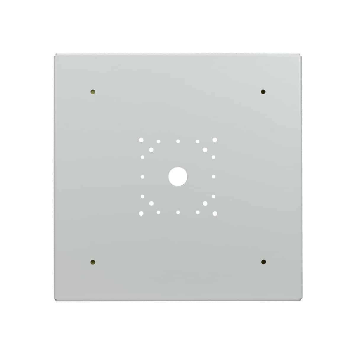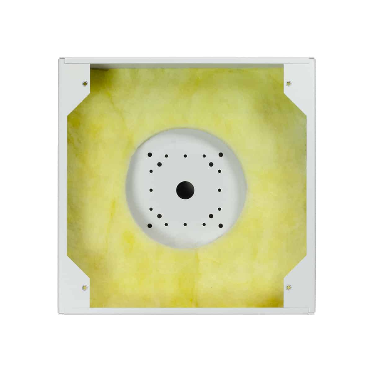 The rust and vandal-resistant surface-mount enclosure for 8″ speakers shall be Lowell model CB84-SGVPO, which shall be galvanized steel with white powder coat finish measuring 11.5″ square x 4″D. It shall feature a rear hole (.875 dia.) for 1/2″ conduit or wire access and provisions to mount to an electrical box (4″ square, 4″ octagon, 1-gang, or 2-gang – not included). It shall also feature four mounting holes and 8-32 rust resistant press nuts to accept the specified screw-mount grille. The enclosure shall include 1″ thick acoustic batting.